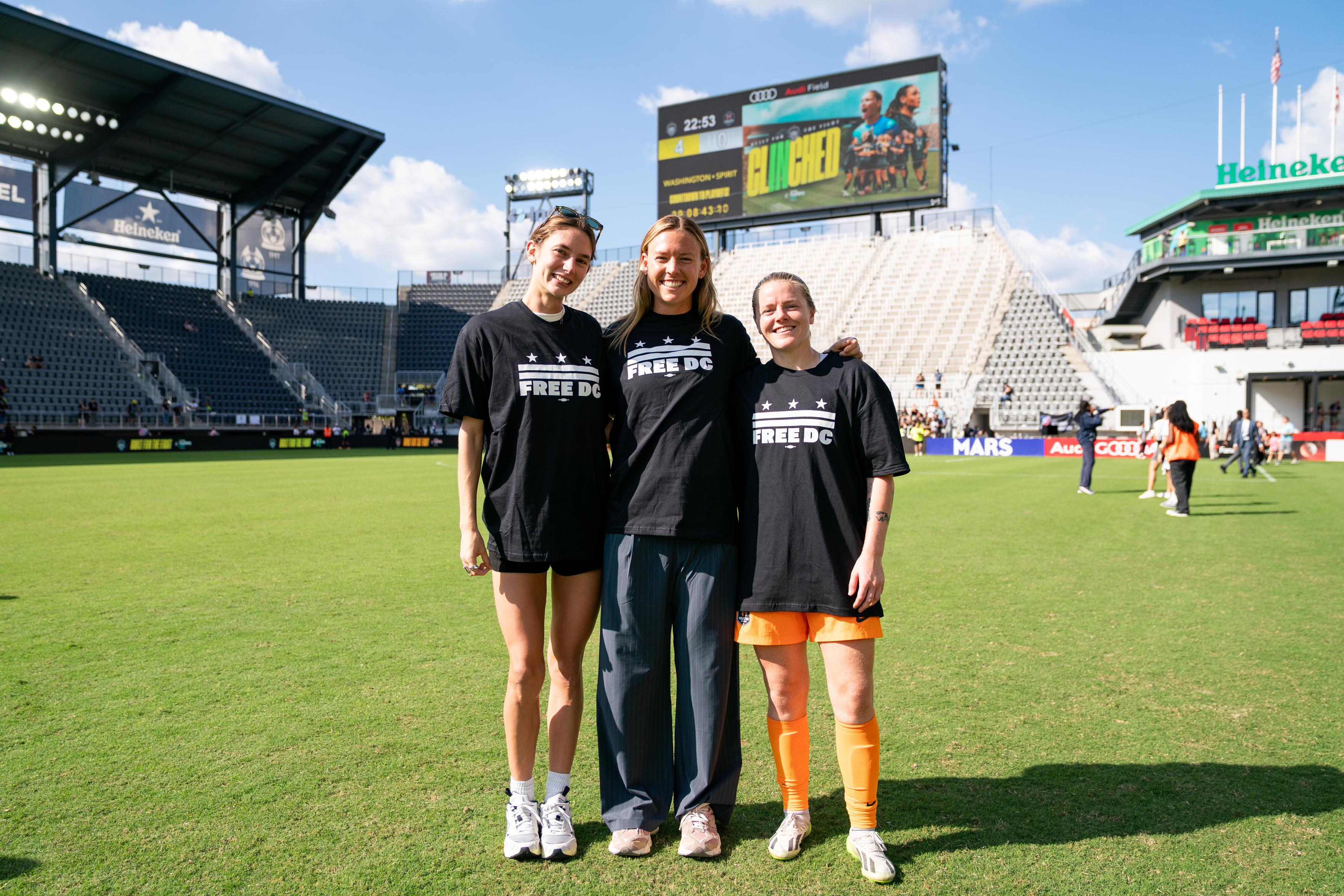 Paige Metayer, Kaylie Collins and Anna Heilferty pose in Free DC t-shirts in the middle of Audi Field