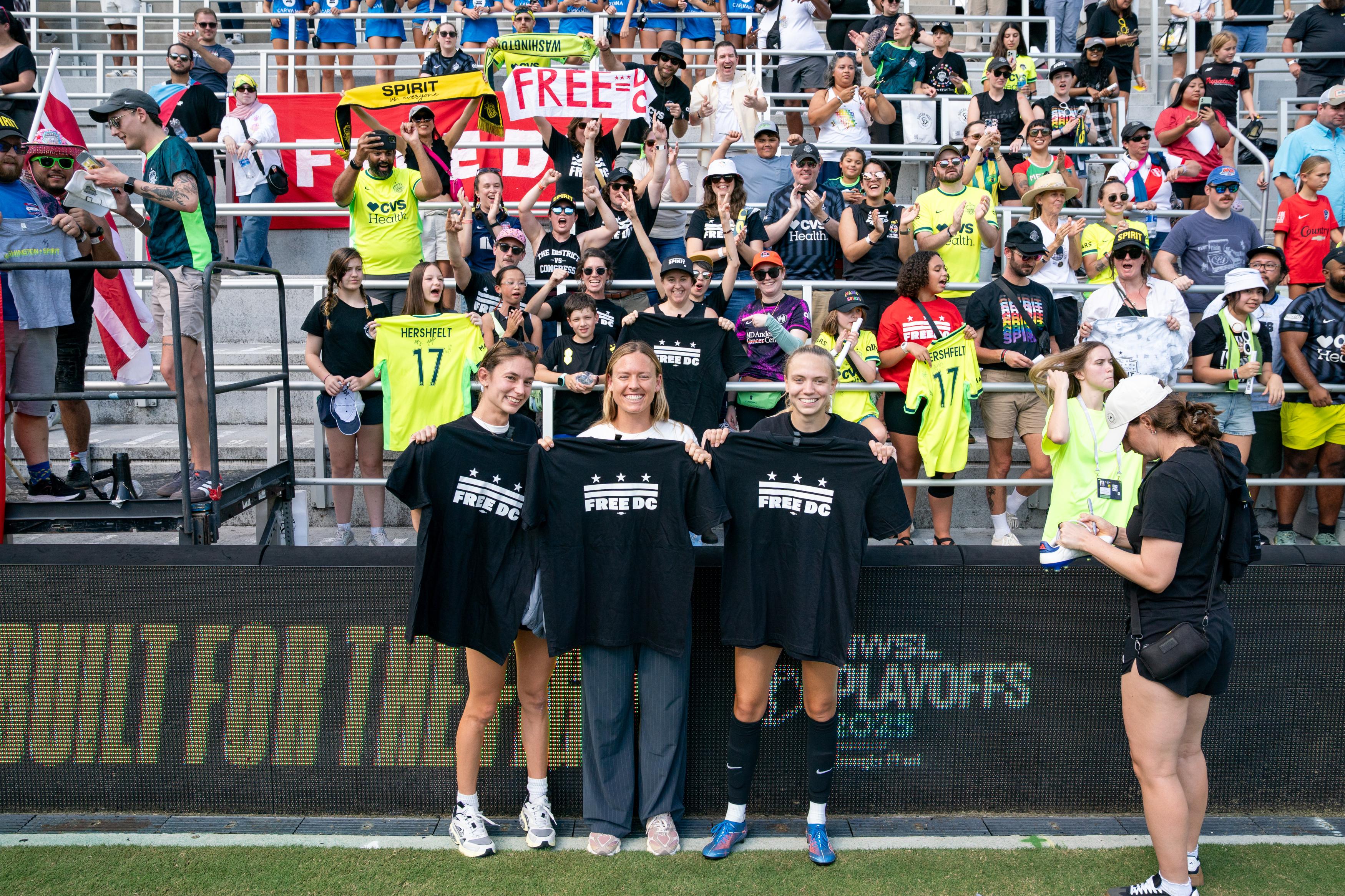 Paige Metayer, Kaylie Collins and Esme Morgan pose with Free DC shirts while a crew of fans in Free DC shirts and Spirit gear cheer behind them