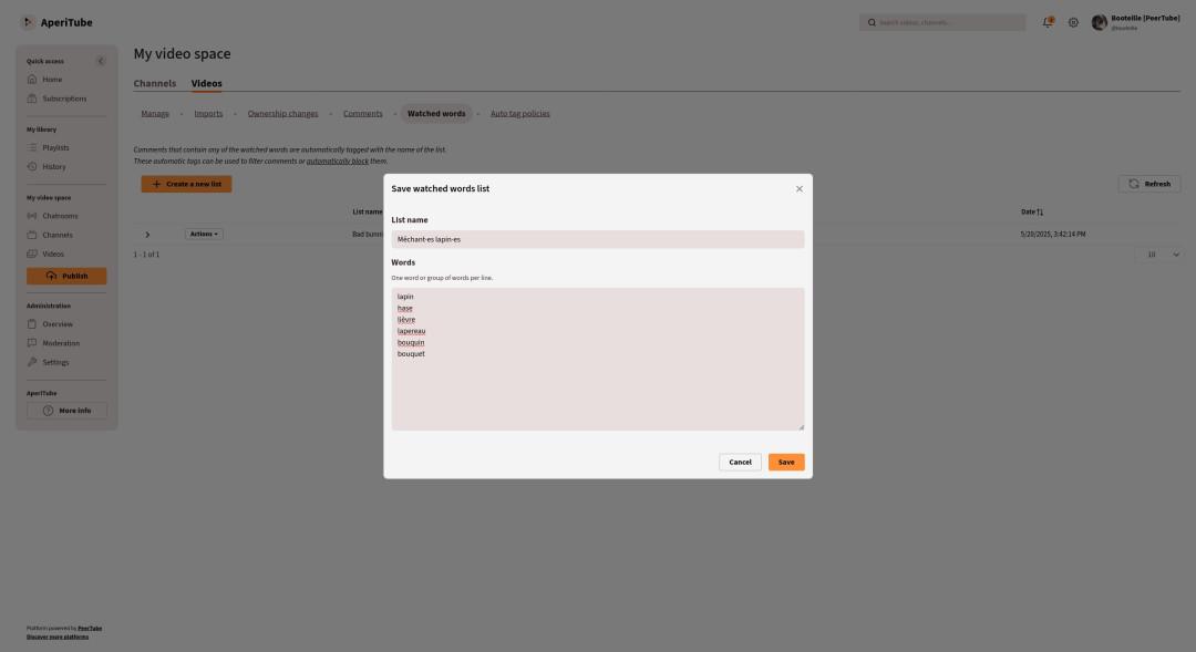 To facilitate content moderation, you can create lists of watched words. Any comment containing a word from one of these lists is automatically tagged, and video makers can choose to block these comments or moderate them on a case-by-case basis.