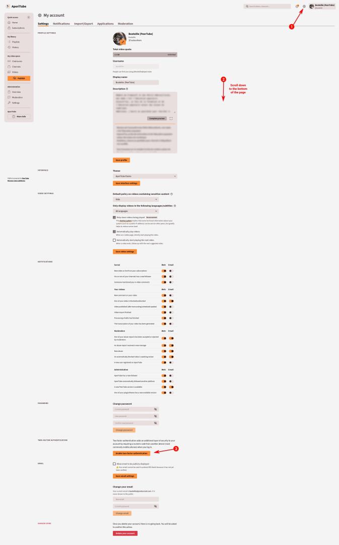 In #PeerTube, you can enhance the security of your account by enabling Two-Factor Authentication (2FA).