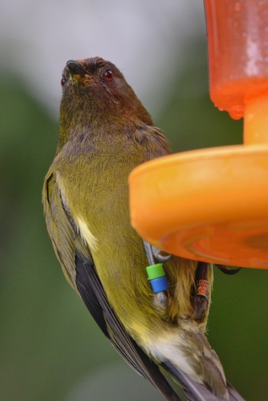 I made 29 observations today of bellbirds seen at our feeders, and that included Right Red twice and Right Blue-Green once, one juvenile once, and all the rest unbanded males.