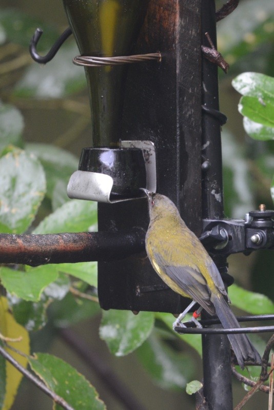 The 1st of January 2026 has been a grey rainy day in Ōtautahi-Christchurch, NZ, and that's kept our garden sugar water feeders busy with korimako (NZ bellbirds) and silvereyes.