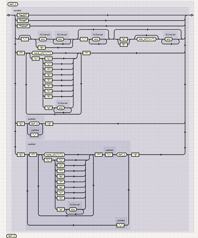Here's an entirely automatically generated railroad syntax diagram for the JSON parser example that comes with my parser combinator library Chumsky (https://github.com/zesterer/chumsky/).