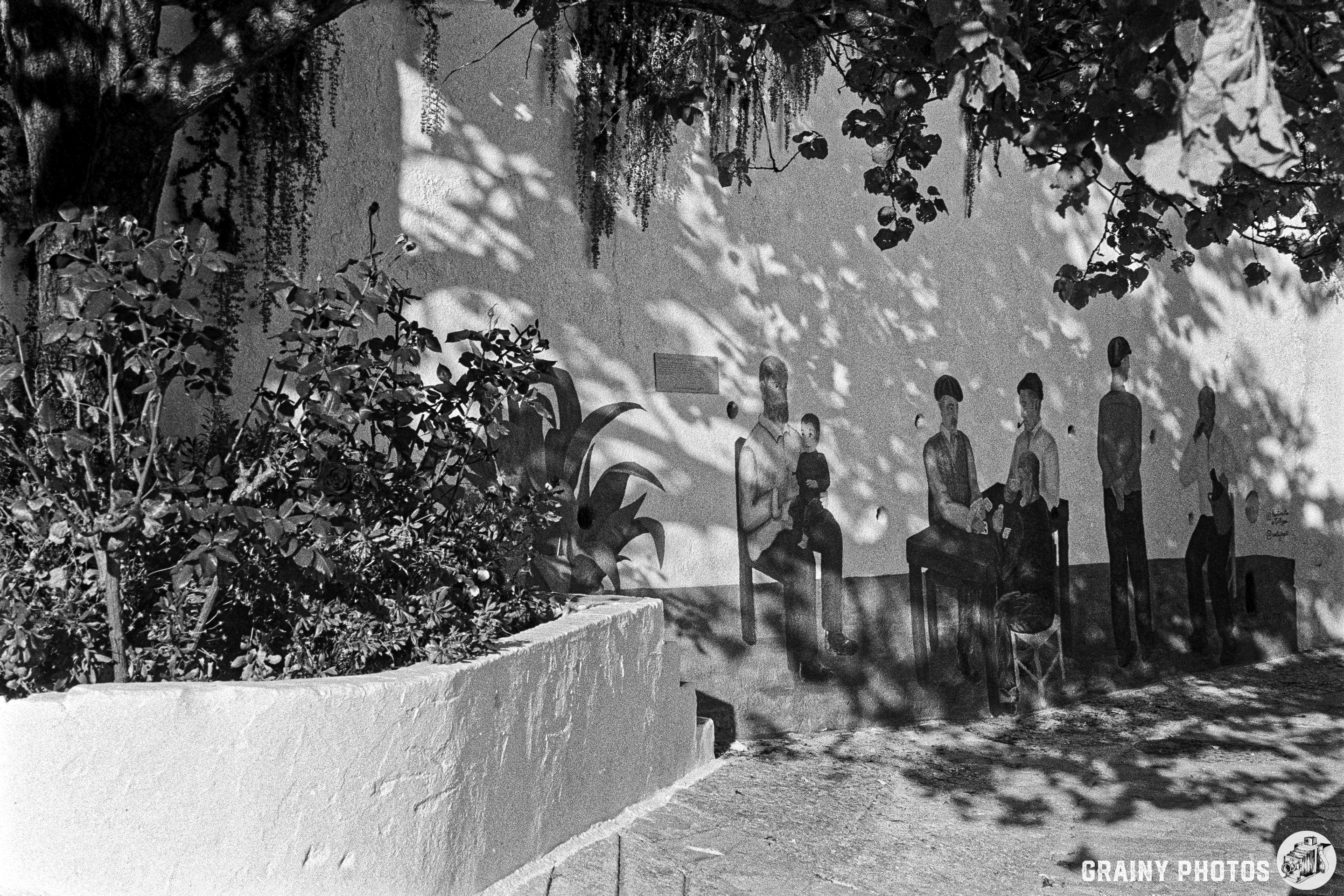 This black-and-white photograph captures an old, narrow wooden shutter door deeply set into a thick, ancient stone wall. The door consists of tall vertical planks of weathered wood, their grain still visible beneath years of sun, rain, and time, giving the surface a gently uneven texture full of small cracks and soft wear. Across the right side stretches a beautiful hand-forged iron strap hinge shaped like a slender tree branch or climbing vine. The dark iron contrasts sharply with the lighter wood and pale stone. Centered on the door hangs a simple iron ring knocker, its circular ring resting against a small decorative backplate. A small, modern padlock—the only clearly recent object—secures everything, threaded through a hasp and staple near the edge. The surrounding wall is built from irregular blocks of limestone or sandstone, each stone varying in size and shape, held together by thick, weathered mortar lines that have softened and receded over centuries. A plain stone lintel rests above the recessed doorway, its edges smoothed by long use. The whole scene carries a hushed, sculptural stillness. Strong tonal contrasts between the bright rough stone, the darker aged wood, and the deep black of the iron create a composition that feels both intimate and enduring, as though the door has guarded its threshold for hundreds of quiet years.