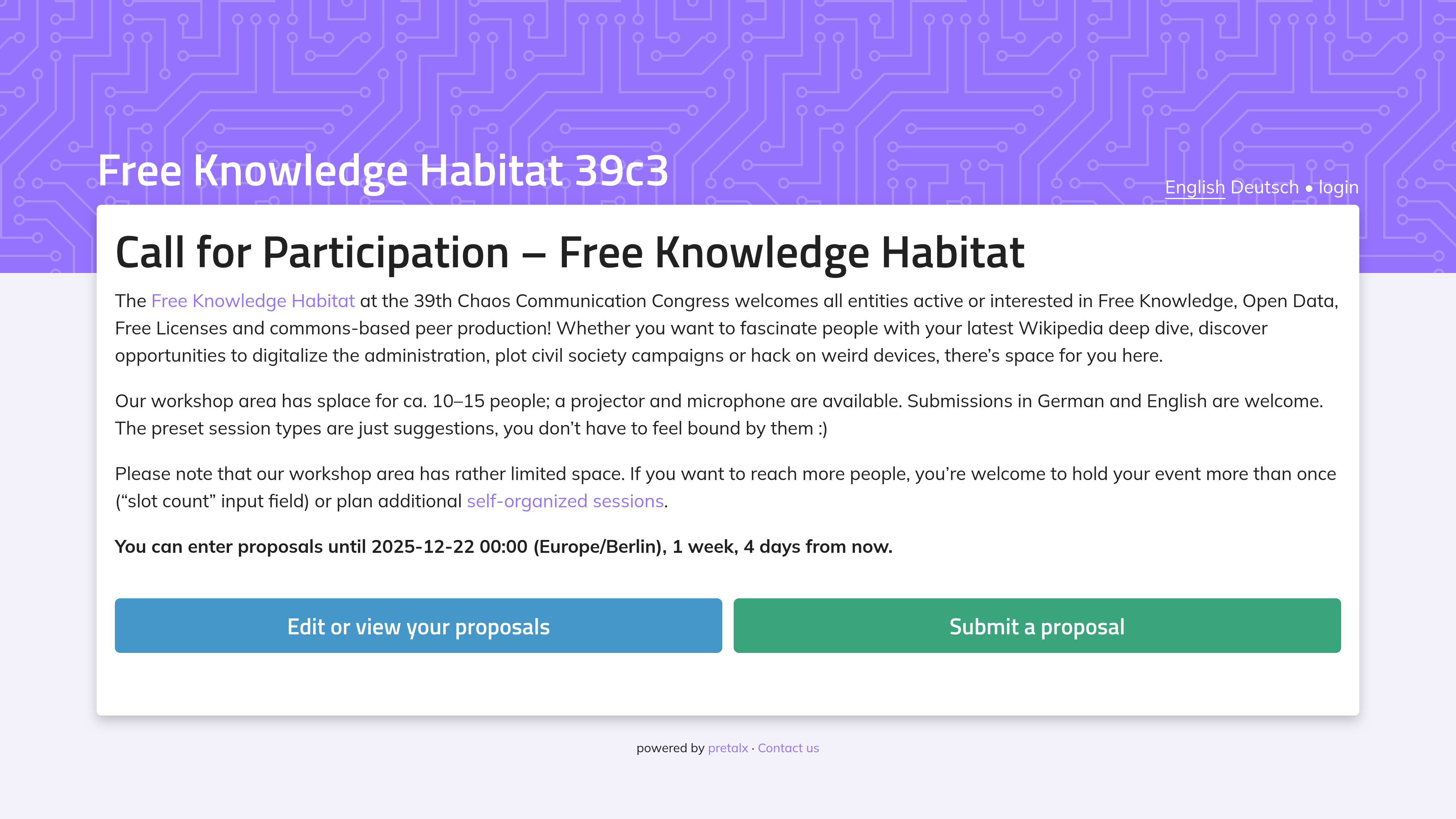 You can enter proposals until 2025-12-22 00:00 (Europe/Berlin), 1 week, 4 days from now.