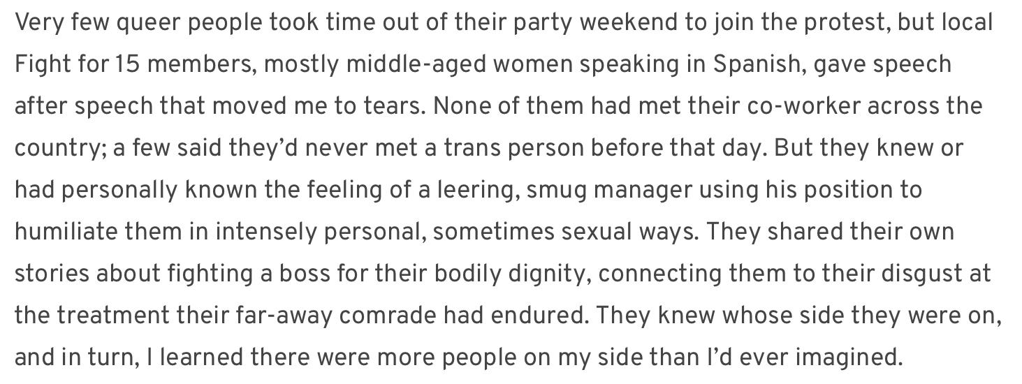 Very few queer people took time out of their party weekend to join the protest, but local Fight for 15 members, mostly middle-aged women speaking in Spanish, gave speech after speech that moved me to tears. None of them had met their co-worker across the country; a few said they’d never met a trans person before that day. But they knew or had personally known the feeling of a leering, smug manager using his position to humiliate them in intensely personal, sometimes sexual ways. They shared their own stories about fighting a boss for their bodily dignity, connecting them to their disgust at the treatment their far-away comrade had endured. They knew whose side they were on, and in turn, I learned there were more people on my side than I’d ever imagined.