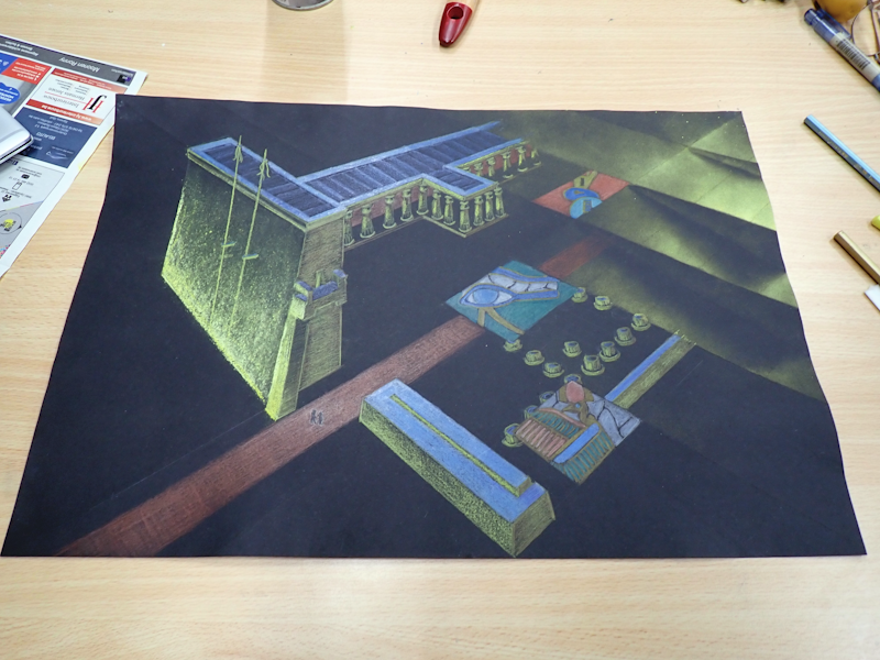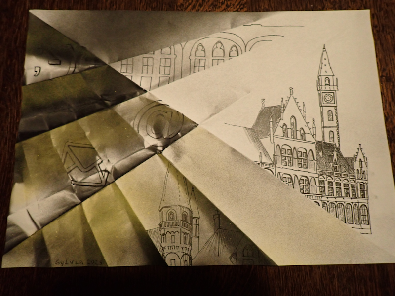We had a cool assignment in #drawing class: (1) fold a big piece of paper such that there are clear shadows on the page; (2) 'fixate the shadows' by spraying paint on it; (3) wet the paper and let it dry under heavy weight to make it straight again; (4) draw fragments of architecture (& other things or people) on parts of the drawing.