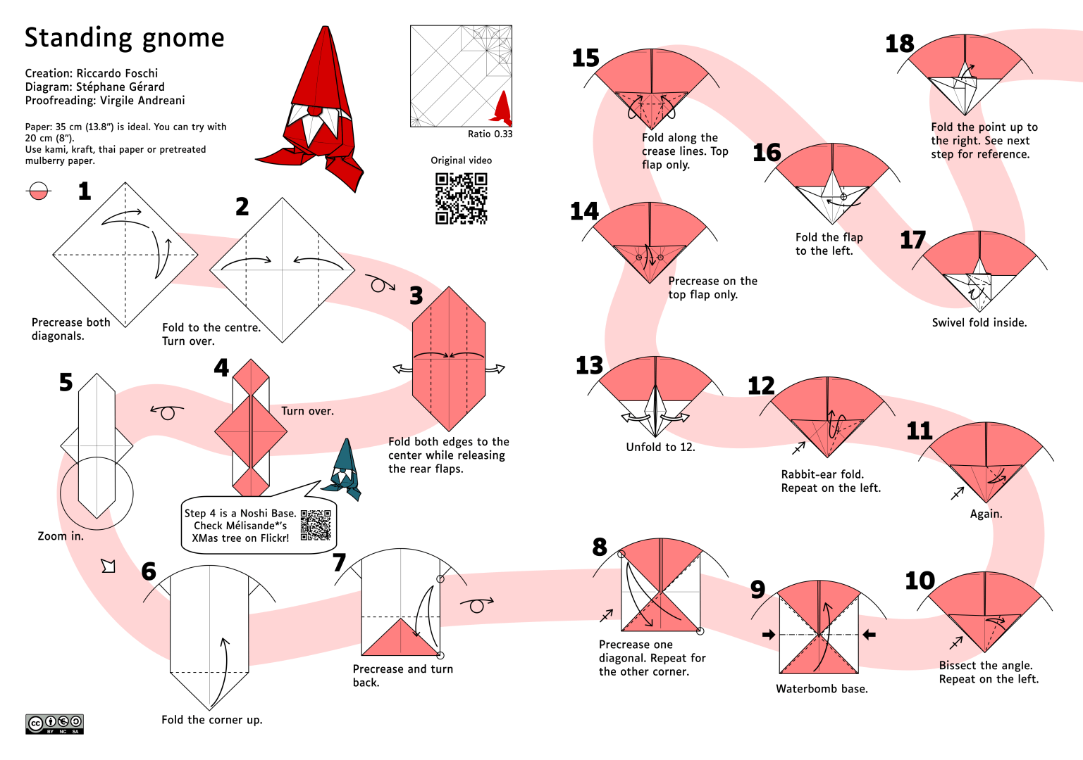 Alliance amusante entre un modèle traditionnel (le casque de samouraï) et le thème de Noël, par Katsuta Kyohei. Le pliage est tellement naturel qu'on dirait que le casque n'attendait que cela ! Le carré de départ est diminué de deux bandes dans l'intersection desquelles est fait le pompon. Ensuite, il ne reste plus qu'à plier le casque avec le carré qui reste. C'est malin !