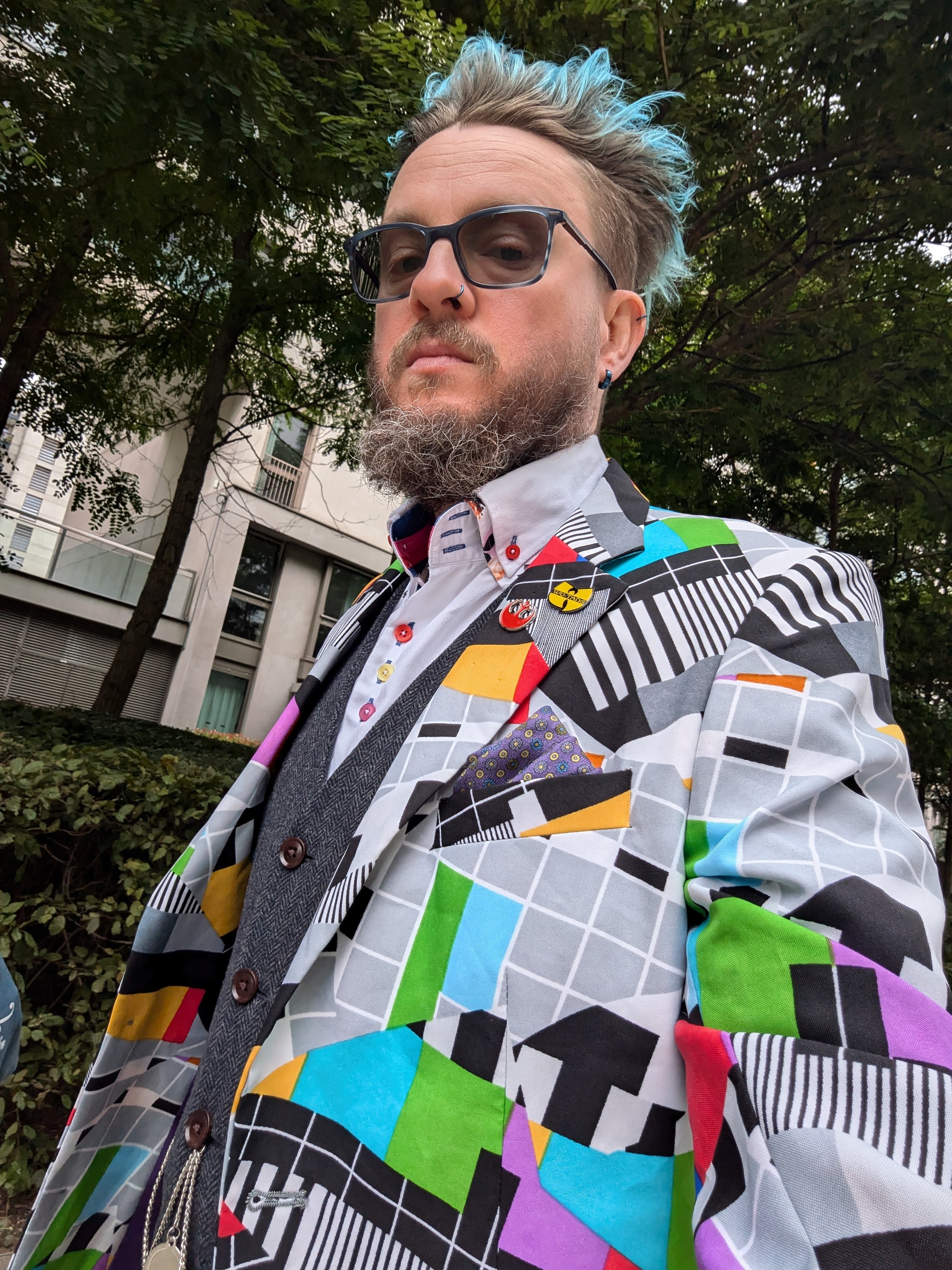 A man in a ridiculous testcard suit