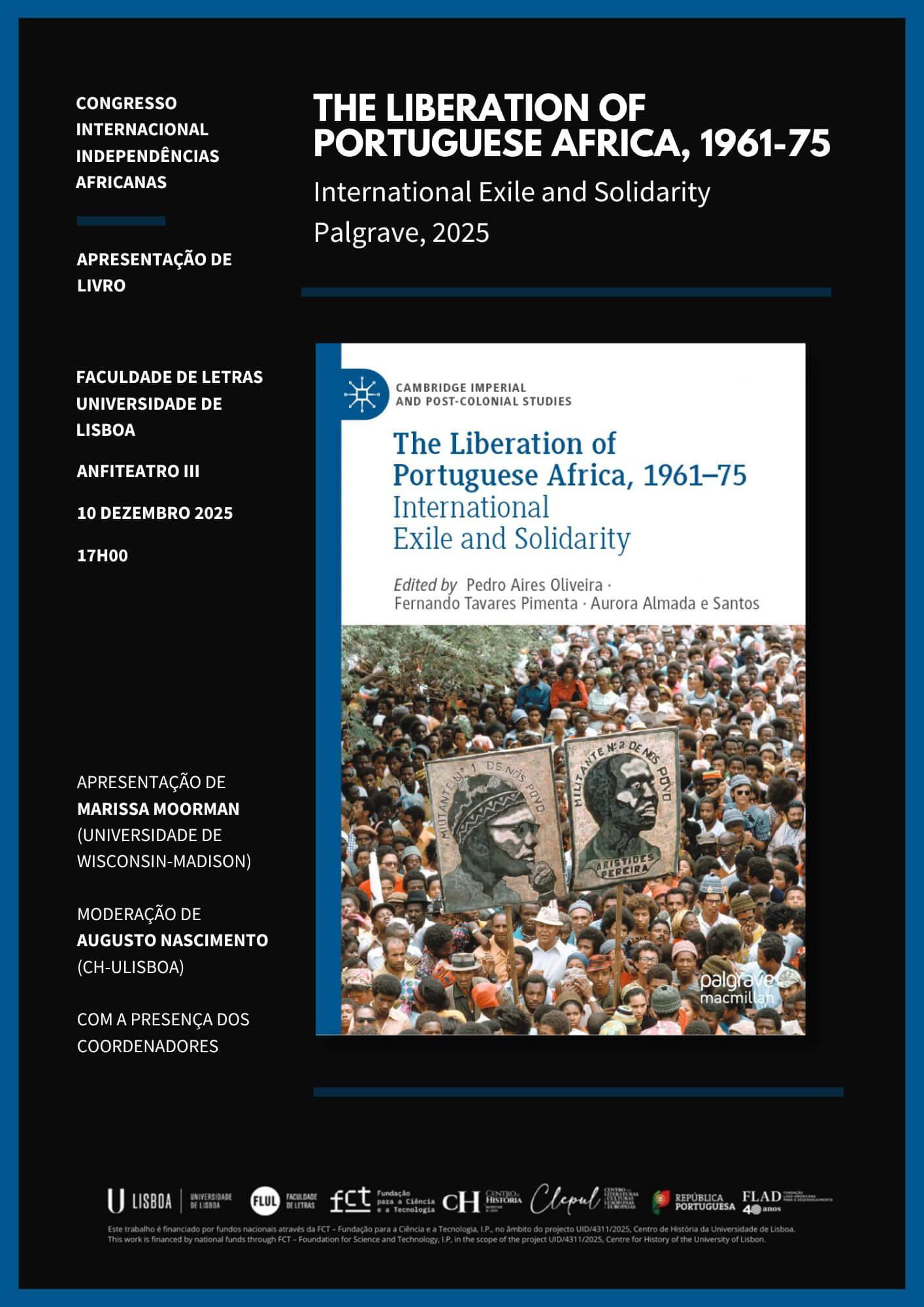 Cartaz da apresentação do livro “The Liberation of Portuguese Africa, 1961-1975. International Exile and Solidarity” (Palgrave, 2025). Congresso Internacional Independências Africanas. Faculdade de Letras da Universidade de Lisboa, Anfiteatro 3, 10 de Dezembro de 2025 às 17 horas. Apresentação de Marissa Moorman (Universidade de Wisconsin-Madison). Moderação de Augusto Nascimento (Centro de História da Universidade de Lisboa). Com as presença dos coordenadores: Pedro Aires Oliveira, Fernando Tavares Pimenta e Aurora Almada e Santos. O cartaz inclui a capa do livro, que é ilustrada por uma fotografia de uma multidão, onde se destacam dois cartazes, um de Amílcar Cabral e outro de Aristides Pereira, captada durante a missão da ONU às ilhas de Cabo Verde em 1975.