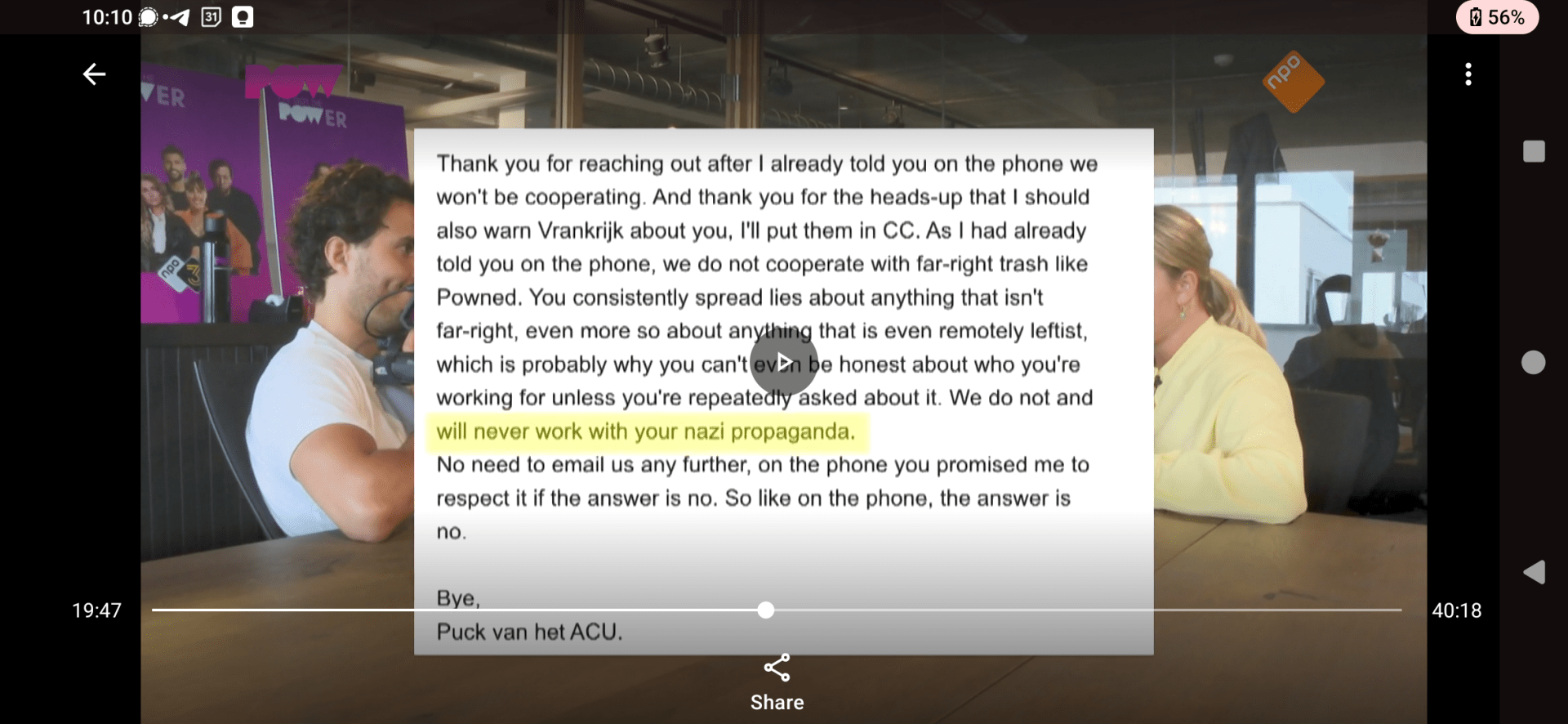 Far-right broadcaster PowNed wanted to make a """documentary""" about squatting and reached out to our collective, hoping we would cooperate. I've sent them an email back. Apparently they liked it, because they showed it in their mockumentary 😂 #powned #squatting #netherlands