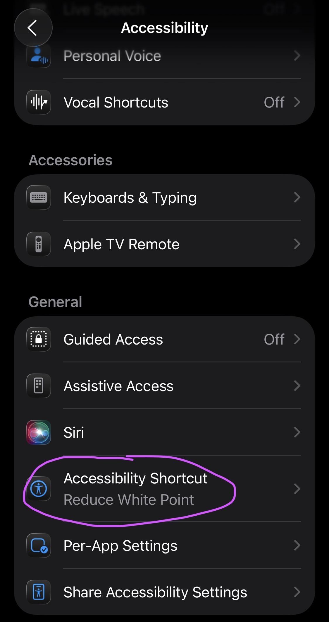 Migraine pro-tip for iOS users: in Settings > Accessibility and under the “General” heading at the bottom, you can set the triple tap of your power button to reduce the white point of your screen. This dramatically drops the brightness of your screen. 👍🏼 #migraine