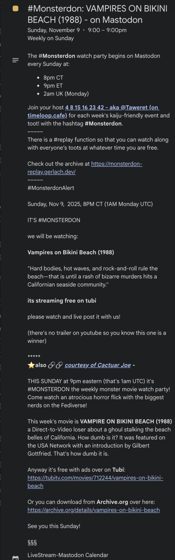 @CactuarJoe @Taweret Hello! I have pasted both of your announcements into the #WatchPartyCalendar (http://bit.ly/MastodonWatchParties ) for this weekend's #Monsterdon VAMPIRES ON BIKINI BEACH (1988)