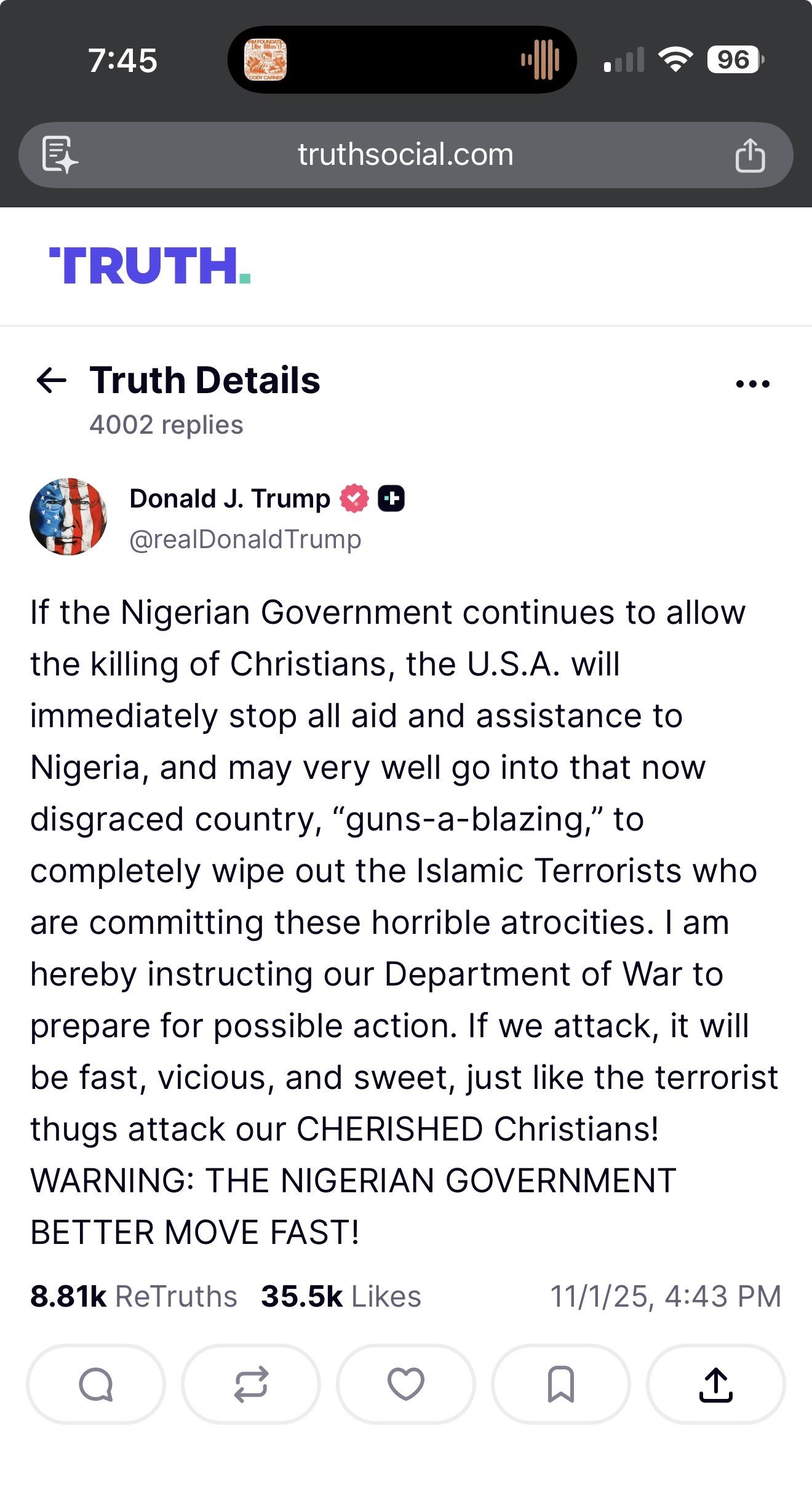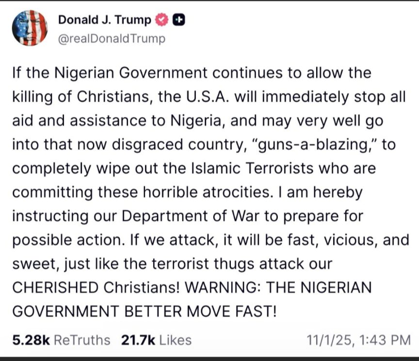 👉🏾 #Trump threatens to attack Nigeria 🇳🇬 https://truthsocial.com/@realDonaldTrump/115476385101120405