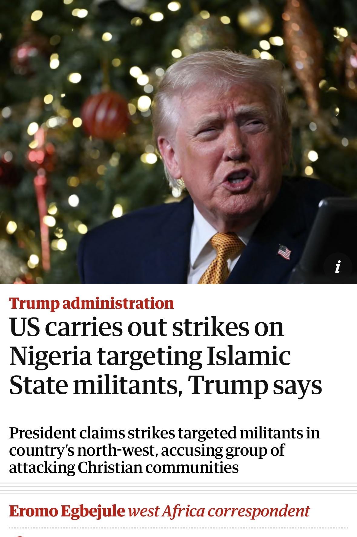Donald Trump is considering "fast" military action in Nigeria if it fails to crack down on the killing of Christians. https://www.japantimes.co.jp/news/2025/11/02/world/politics/trump-us-nigeria-threat/?utm_medium=Social&utm_source=mastodon #worldnews #politics #us #usmilitary #nigeria #terrorism #religion #africa #donaldtrump