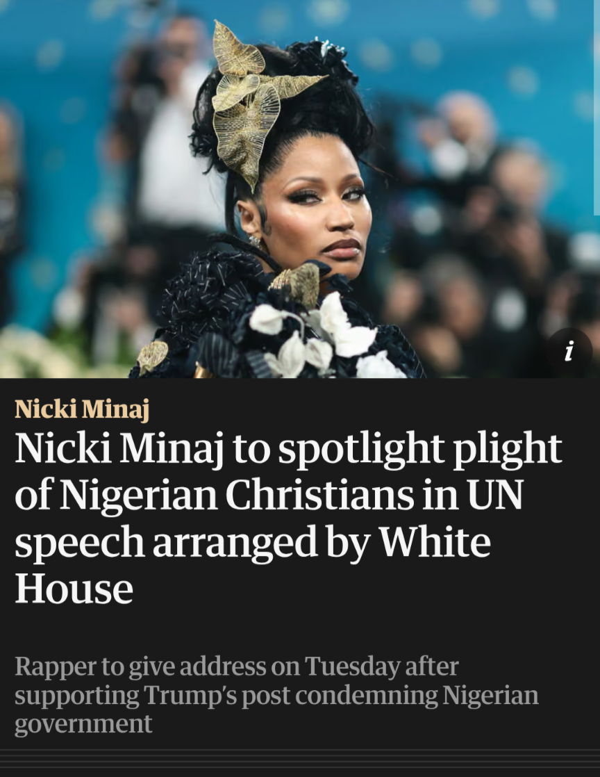 Nicki bloody Minaj is going to address the United Nations on the plight of Nigerian Christians (lemme check, oh yeah, that includes me).