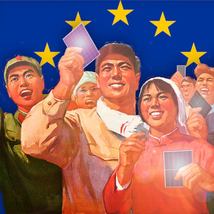 A Chinese Communist propaganda poster showing a cross-section of Chinese people waving the Little Red Book. The Little Red Book has been replaced with solar panels. The background has been replaced with the EU flag.