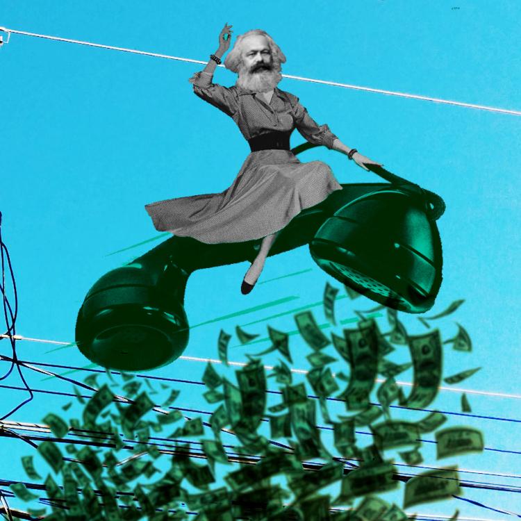A female figure in a 1960s dress and gloves, flying through the air astride a Western Electric Bell telephone handset. Her head has been replaced with the head of Karl Marx. A shower of US hundred dollar bills flows out of the receiver's earpiece and mic. In the background is a telephone pole with many wires attached to it, slicing chords through the blue sky.