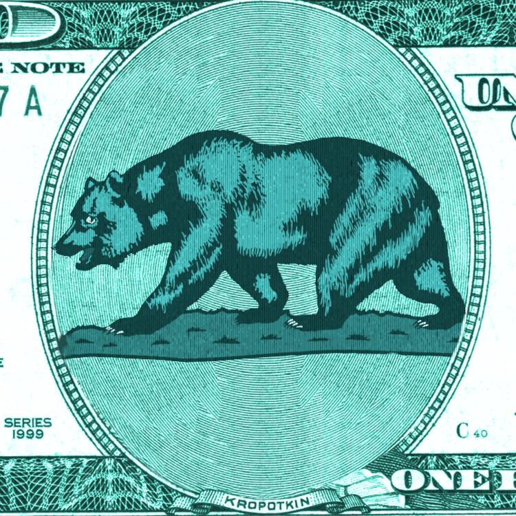 A US $100 bill, tinted blue. Benjamin Franklin has been replaced with the bear from the California state flag. The FRANKLIN caption in the scrollwork below the portrait oval has been replaced with KROPOTKIN.