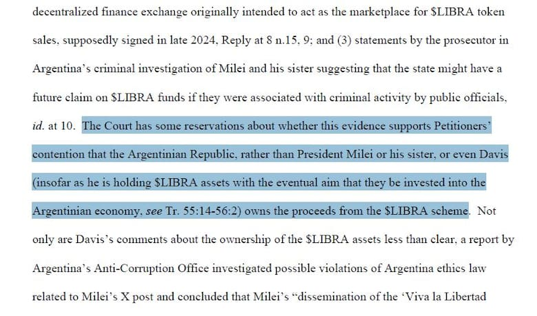 Today in the argie press they highlight this interesting decision by Judge Jennifer Rochon of the Federal District Court for the Southern District of New York (regarding Javier Milei's and Hayden Davis's $LIBRA crypto scam).