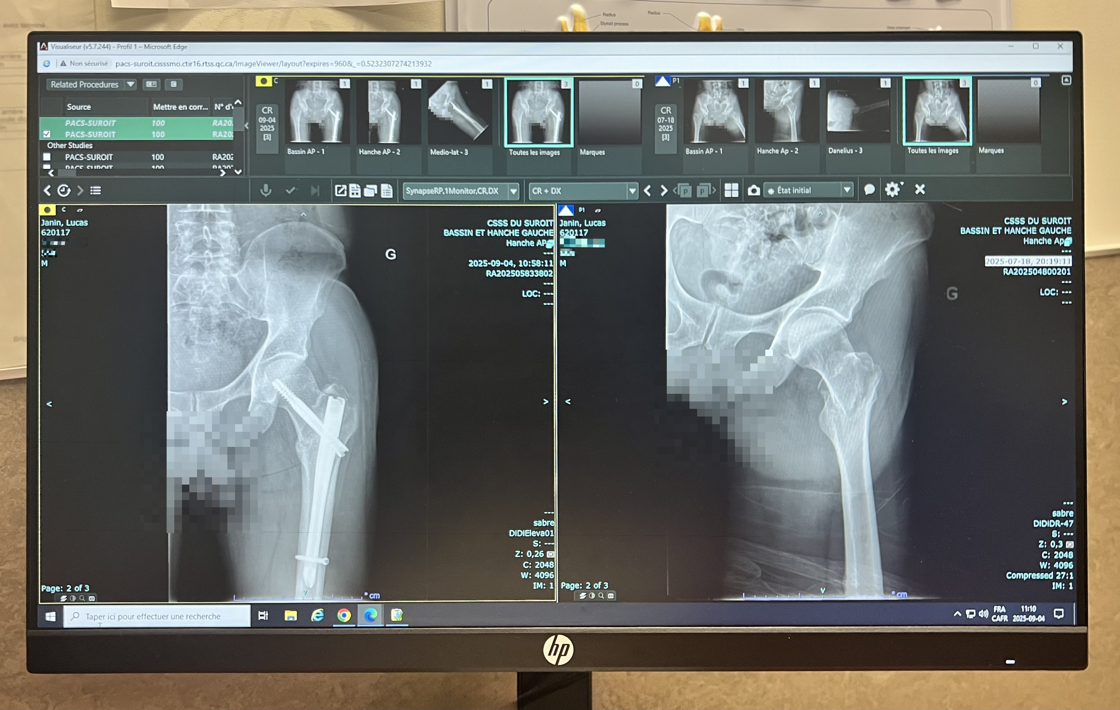 This image captures a perspective from within a modern, blue pedestrian bridge. The bridge has prominent, bright blue metal beams and white railings, creating a strong geometric pattern in the foreground. The path across the bridge is made of a grey, textured material. Looking beyond the bridge, a wide, open green field stretches into the distance under a cloudy, grey sky. A few distant trees are visible along the horizon, and one or two dark shapes, possibly animals like cows, can be seen grazing in the field.