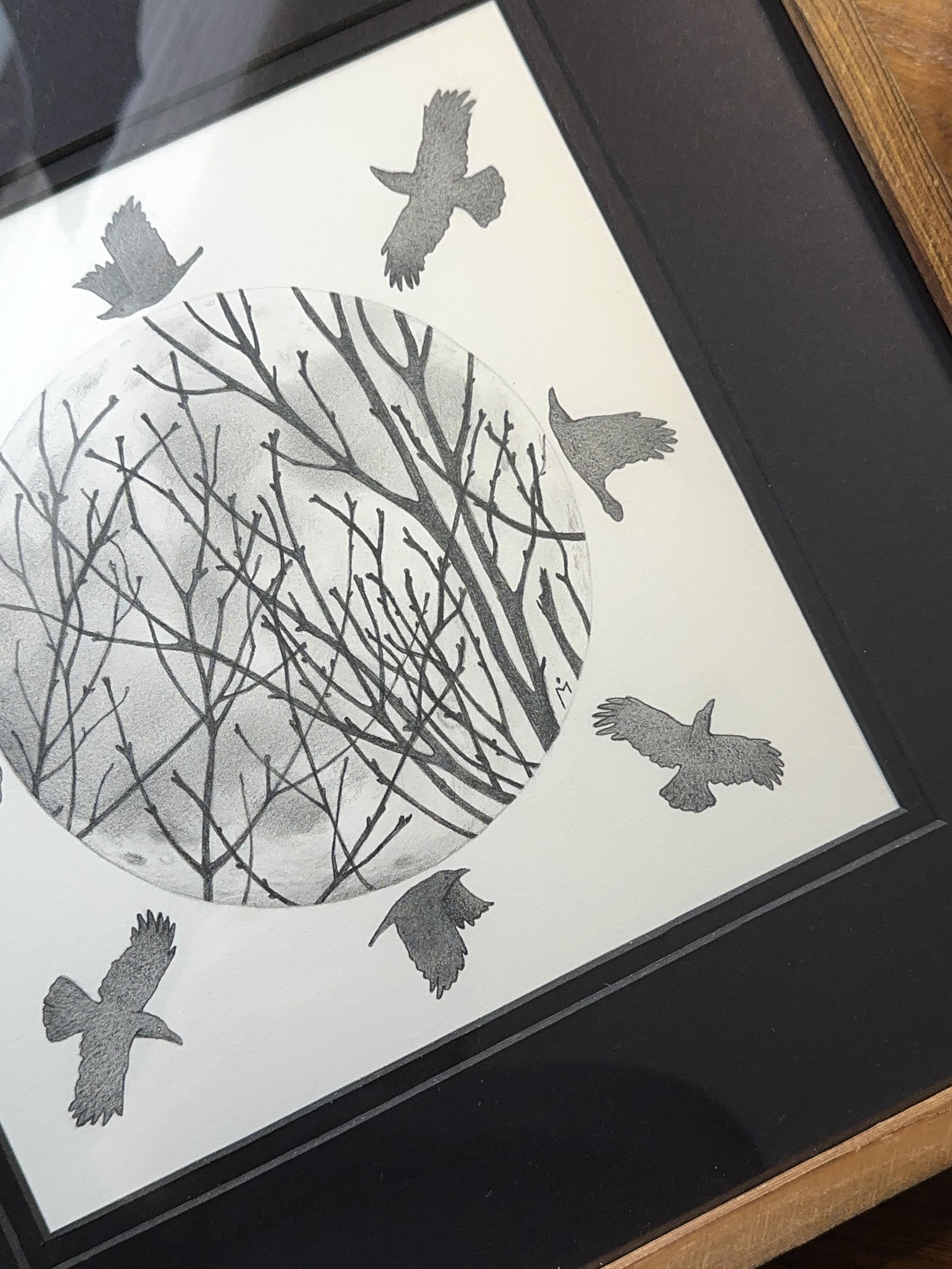 Framed, original pencil drawing of crows flying around a winter moon with the silhouette of trees limbs