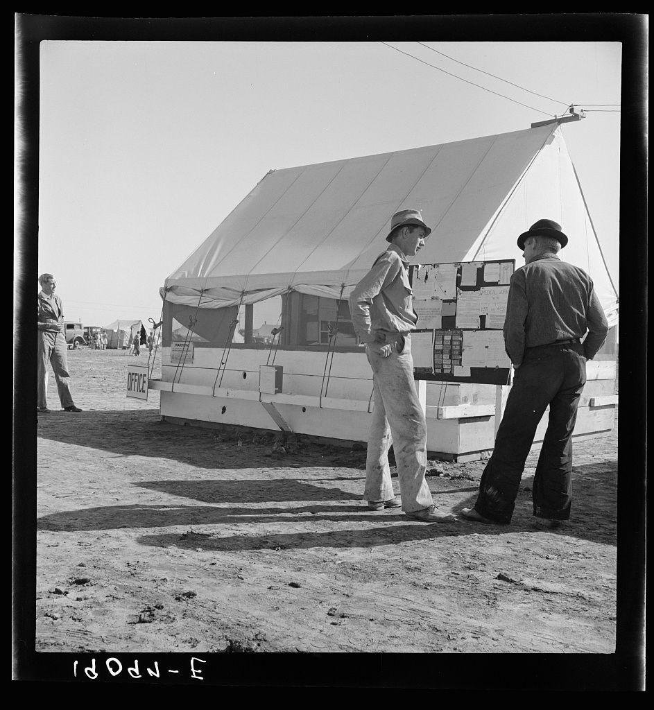 Untitled photo, possibly related to: Farm Security Administration (FSA) migratory labor camp (emergency). Migratory workers, in camp for the pea harvest, scan the bulletin board at entrance