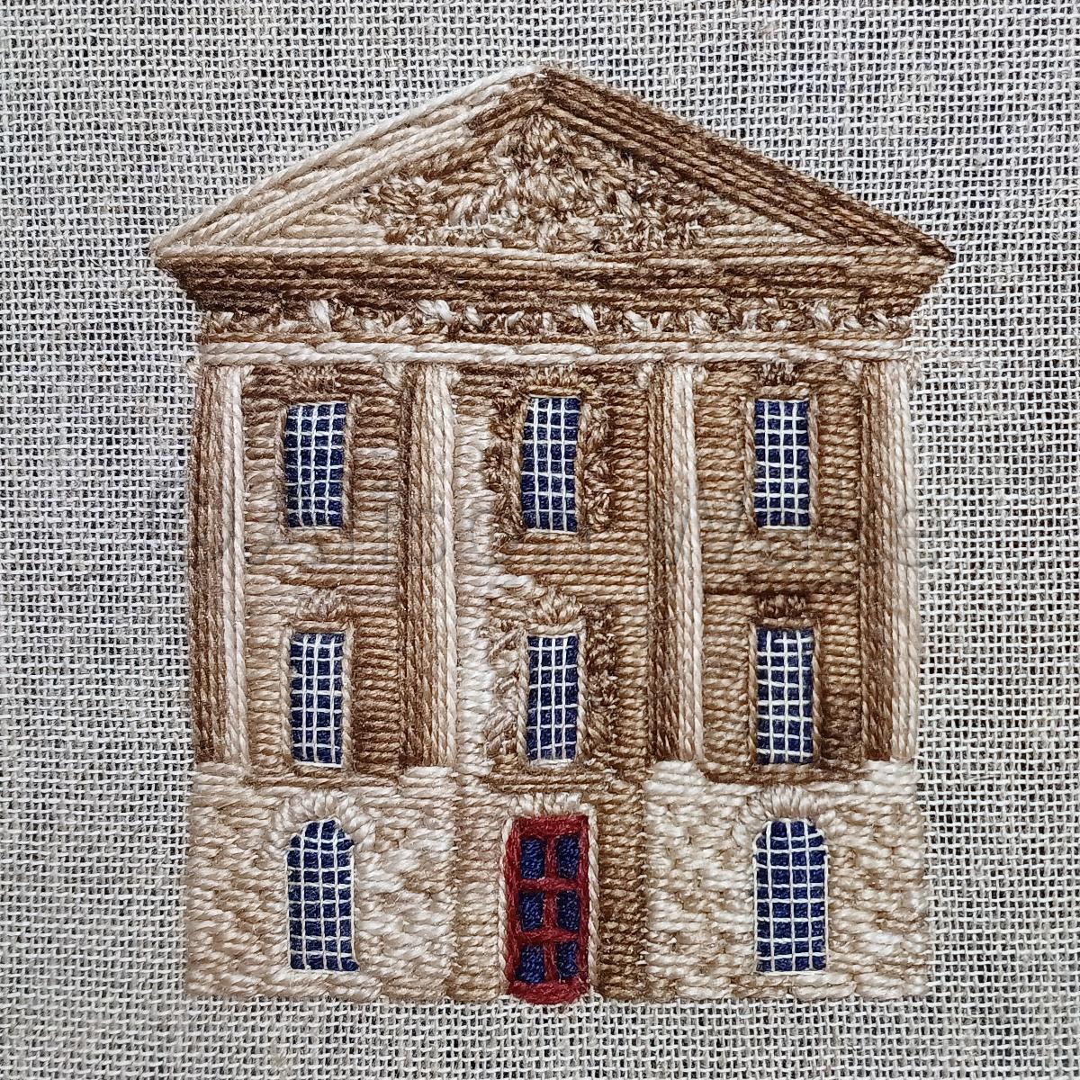 Black and white photo of a Sylvia Sidney posing in a room with dark floor and white wall, wearing a wool suit with two contrasting fabrics, one dark and one light with a subtle check pattern. The skirt has a slight flare and ends mid-calf. The jacked has large white buttons pinning back large lapels. She wears short gloves and a hat with a curving brim, and holds a small matching handbag.
