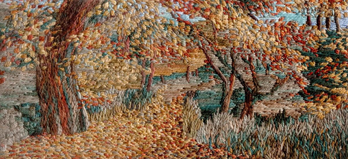 Painting in a red and pink palette depicting a woman with long brown hair wearing a frilly long-sleeved dress, lying on her side on the floor. Two floating hands hold up a pearl necklace near her throat. A pair of rabbits stands near her torso, and a pair of swans stands behind her.