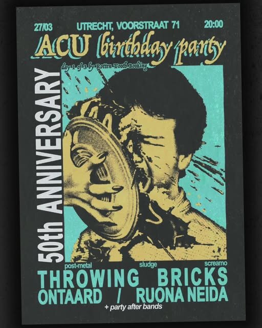 ππππππππππ ACU turns 50 this year, and we are having a weekend of celebration! Every day is put for you together by a different booker, who has been active recently within ACU walls. Friday, the first day of the party, will be spent with friends of @rotten.tooth.punk, bands and people who supported the place and brought heavy music to our stage. Throwing Bricks ~ screamo/sludge Throwing Bricks plays crushing sludge shaped by hardcore punk, black metal, and screamo. Raw, furious, and emotionally heavy β harsh vocals, dirty bass, low melodic guitars, and relentless drums. @throwingbricksband Ontaard ~ post-metal Black metal riffs, spoken word, and noise into a sound thatβs melodic, heavy, and raw. @ontaardband Ruona Neida ~ screamo Harsh, tight and melodic screamo. Check out the debut long-play, which in fact is even shorter than your attention span. @ruona.neida Thanks to @smbduknow of Ruona Neida for the poster! Daily and full weekend tickets are available on acu.nl πππποΏ½ #acu #acuutrecht #utrecht