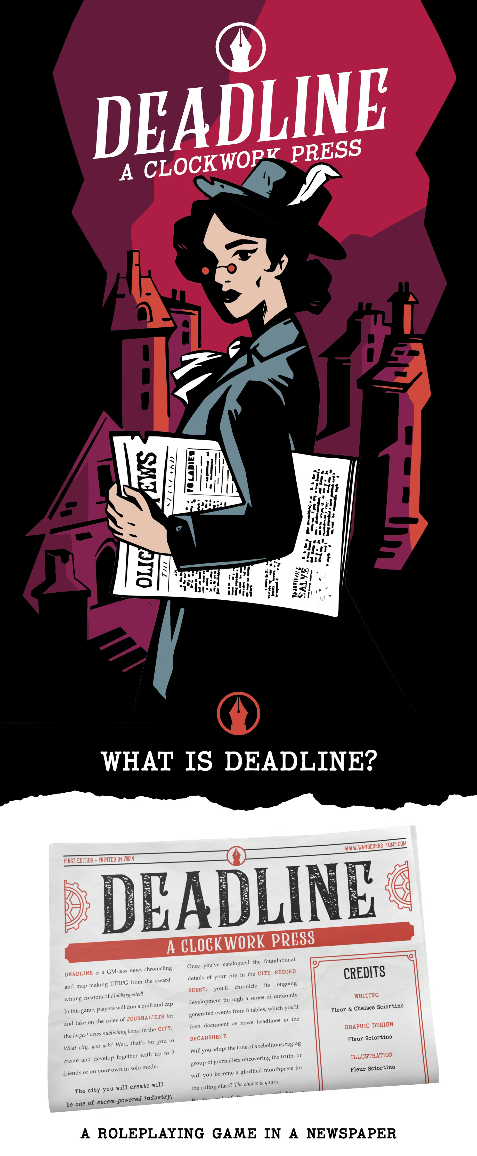 On continue avec Deadline - A Clockwork Press, un jdr (solo ou en groupe) de création de map et d'une gazette. Assez court, plein de table random avec des prompts intéressants, l'idée étant de créer une ville à la Dishonored et ensuite d'écrire des articles sur les événements qui la secouent. J'ai bien aimé le lire et y jouer !