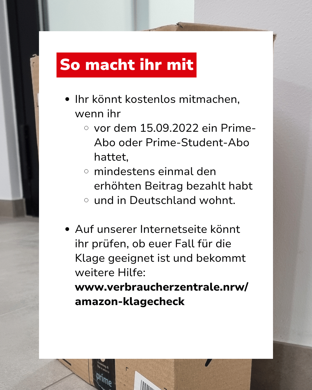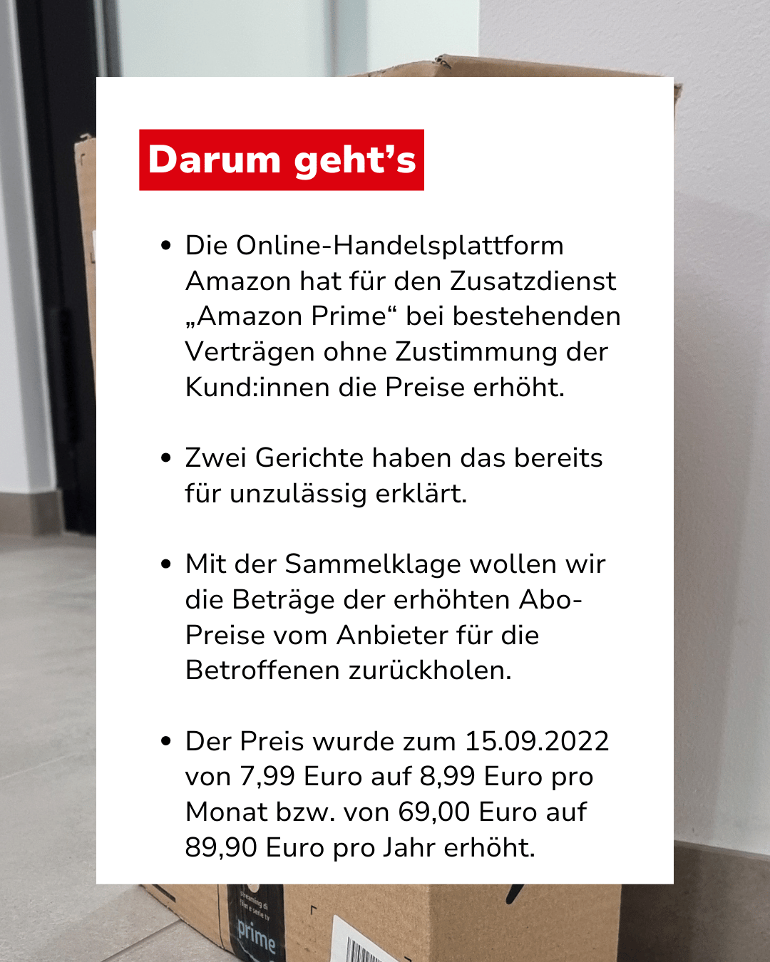 Es ist soweit: Das Klageregister ist eröffnet! Wenn ihr Amazon Prime oder Amazon Prime Student vor dem 15.09.2022 abonniert hattet und seitdem mehr bezahlen musstet, könnt ihr euch kostenlos unserer Klage anschließen. Bereits zwei Gerichte stützen unsere Ansicht, dass die einseitige Preiserhöhung nicht rechtmäßig war. Mit dieser Klage wollen wir erreichen, dass Amazon den Betroffenen das zu viel gezahlte Geld erstattet.