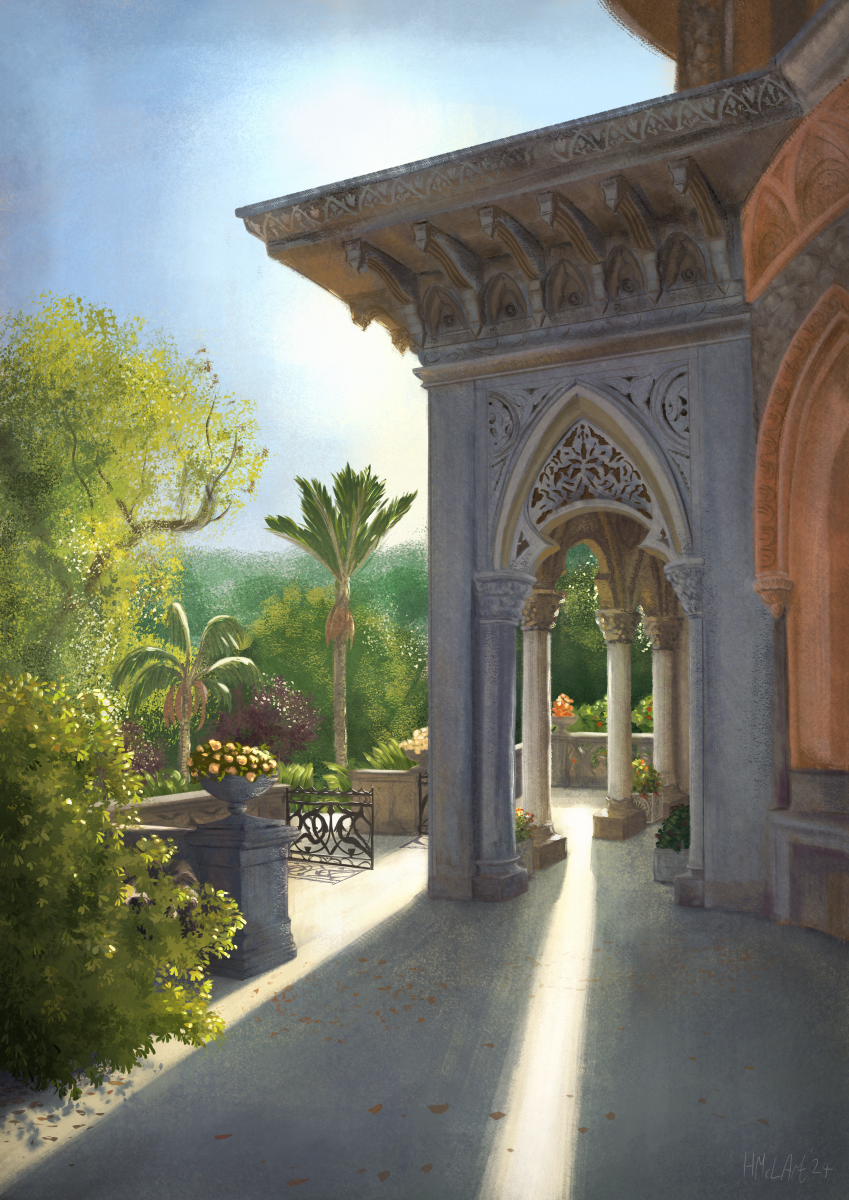 Painted at the end of 2024 in Clip Studio, using my own photo from Portugal as reference. It is the palace at Monserrat, near Sintra. I struggled quite a bit with it at the time, but I still like how it came out, overall.