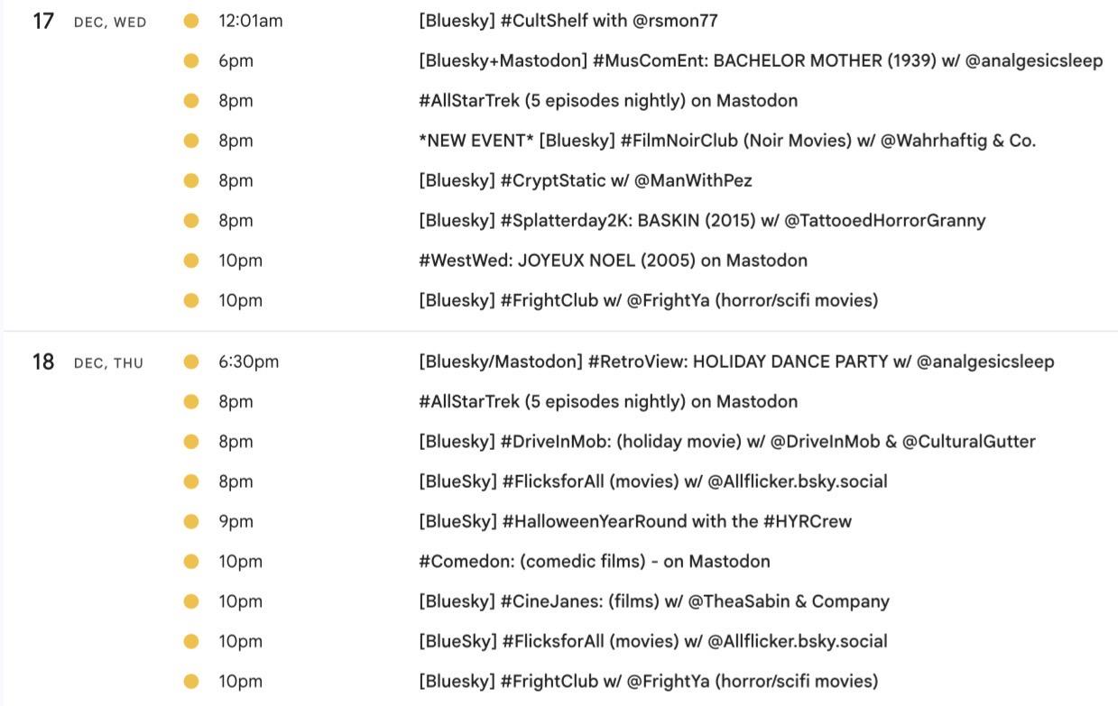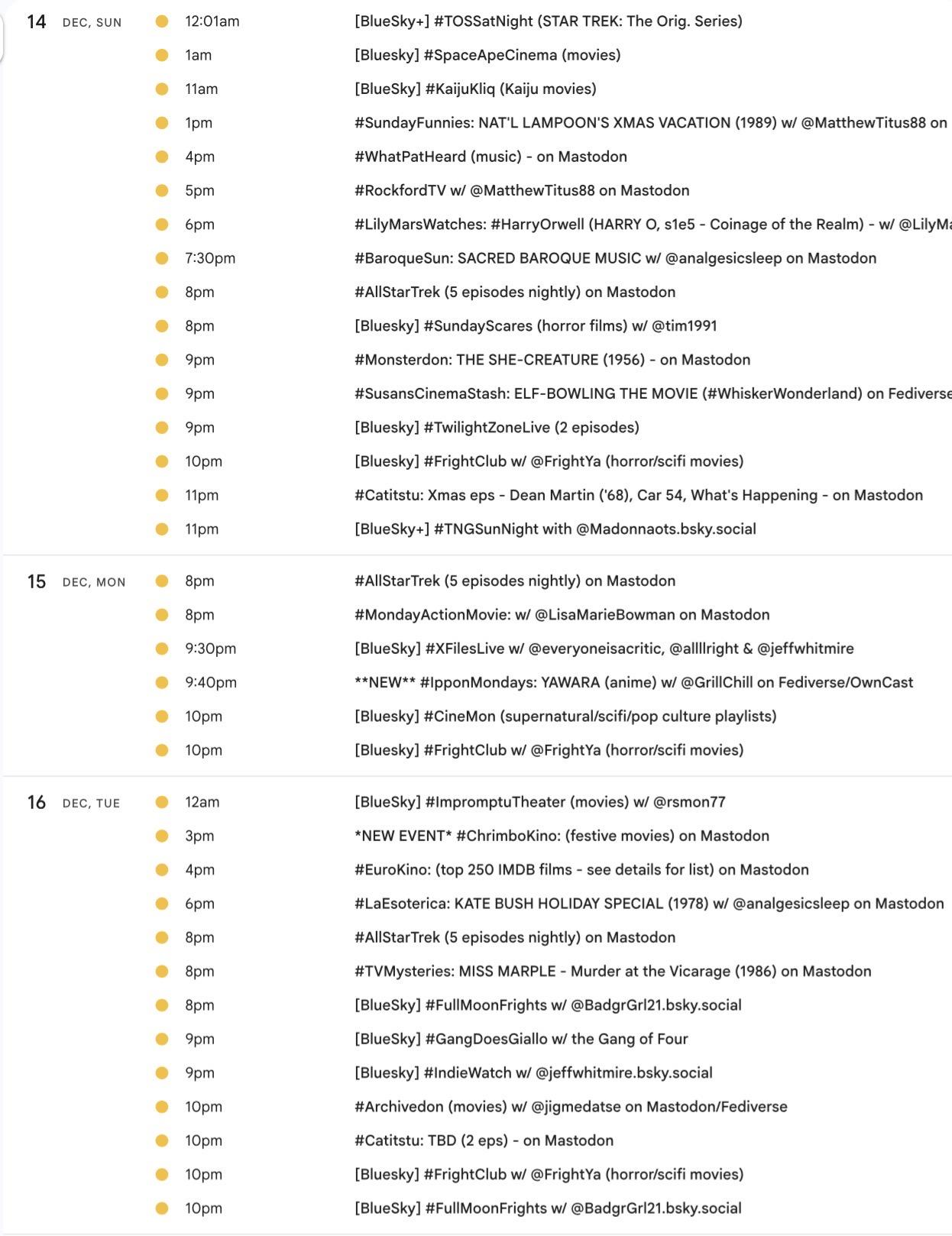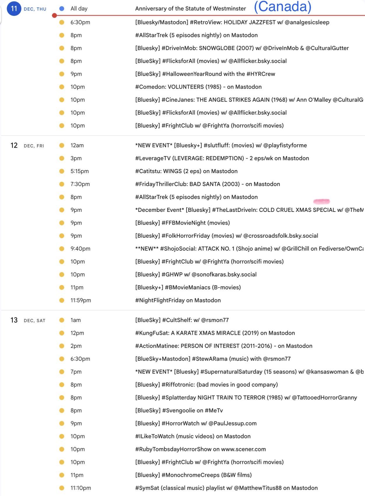 📺 It's the weekly #Mastodon/ #Fediverse #WatchPartyCalendar for Dec. 11-18, 2025 ❄️ (Thu-Thu) crammed with holiday programming🎄🎁✨