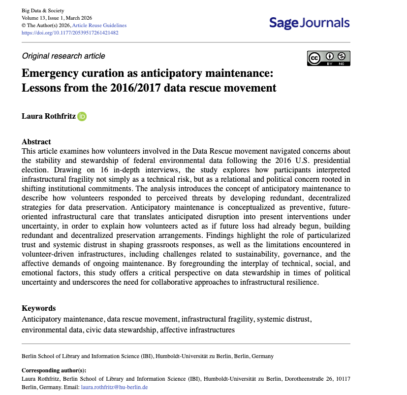 My paper is out in Big Data & Society : “Emergency curation as anticipatory maintenance: Lessons from the 2016/2017 #DataRescue movement.” https://doi.org/10.1177/20539517261421482