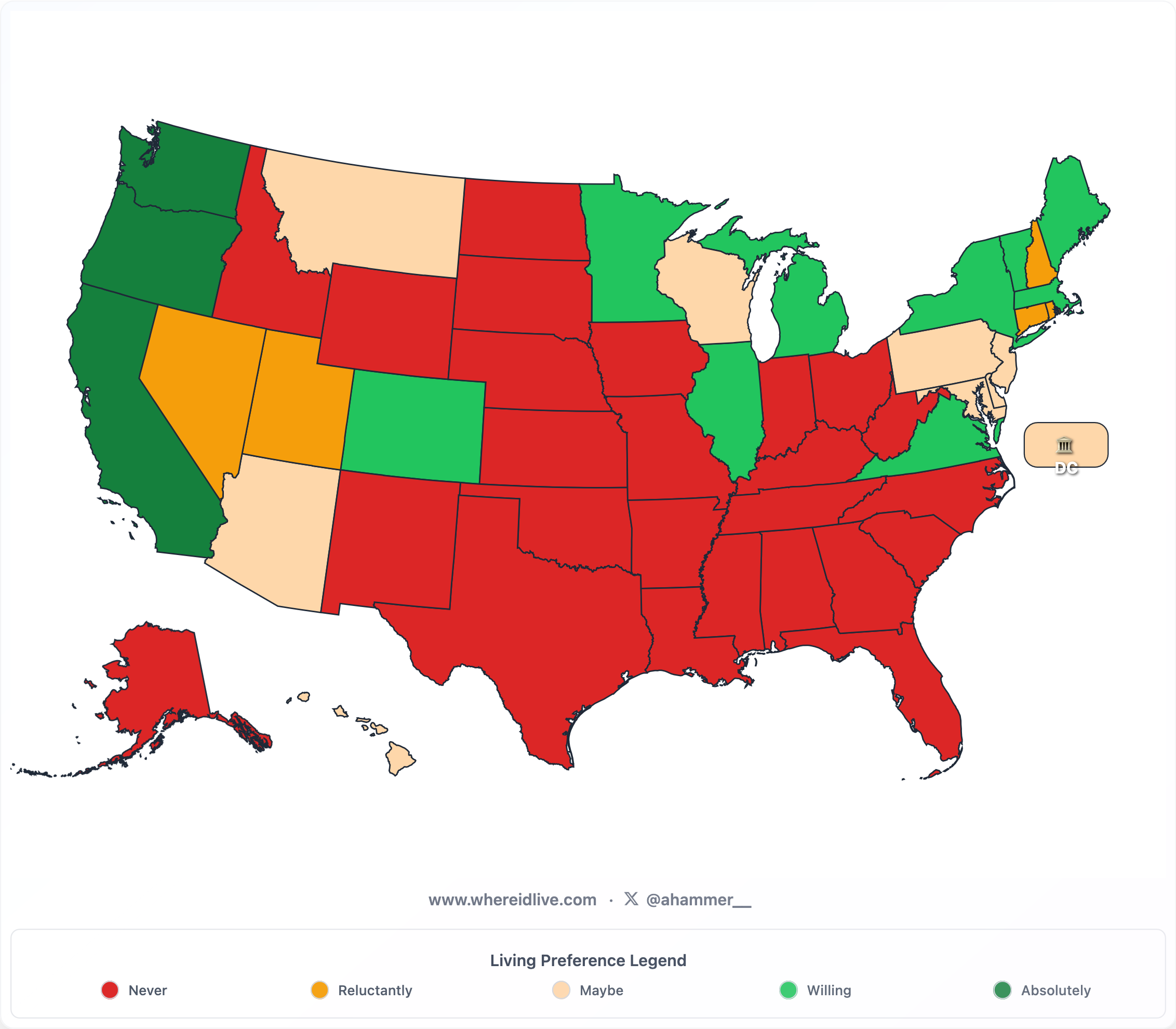Fun exercise thinking about U.S. states I would live in or not or somewhat ambivalent about.