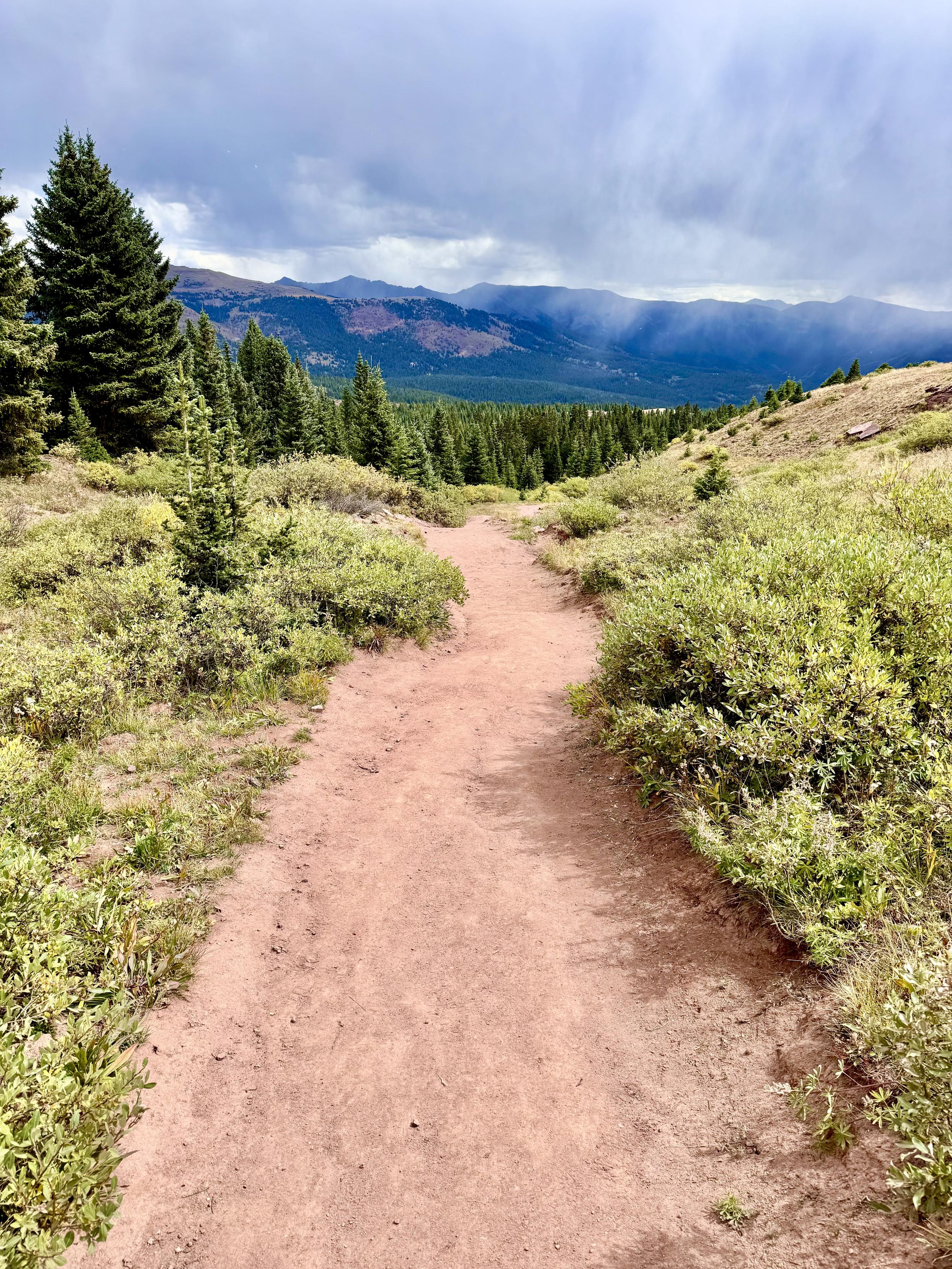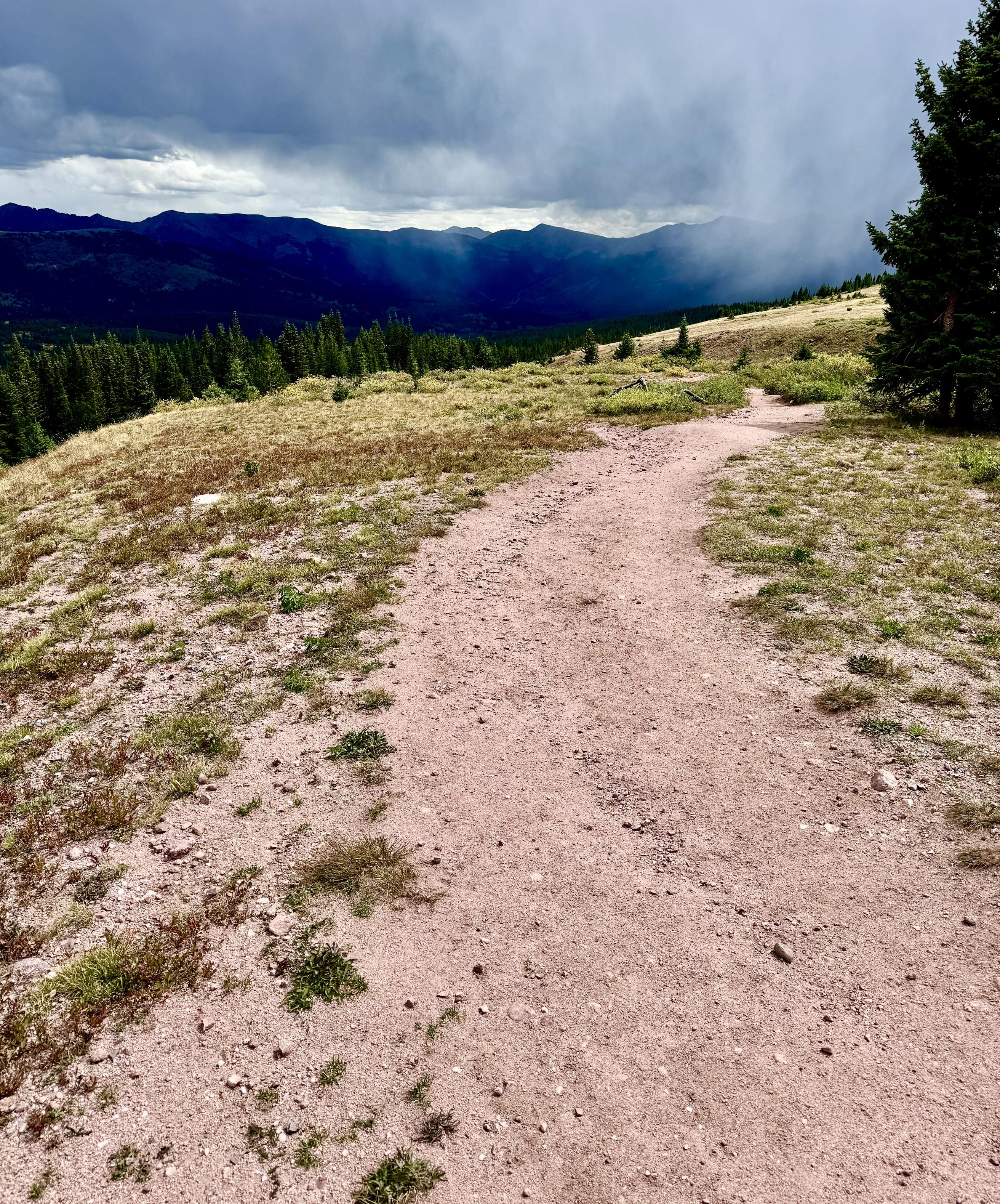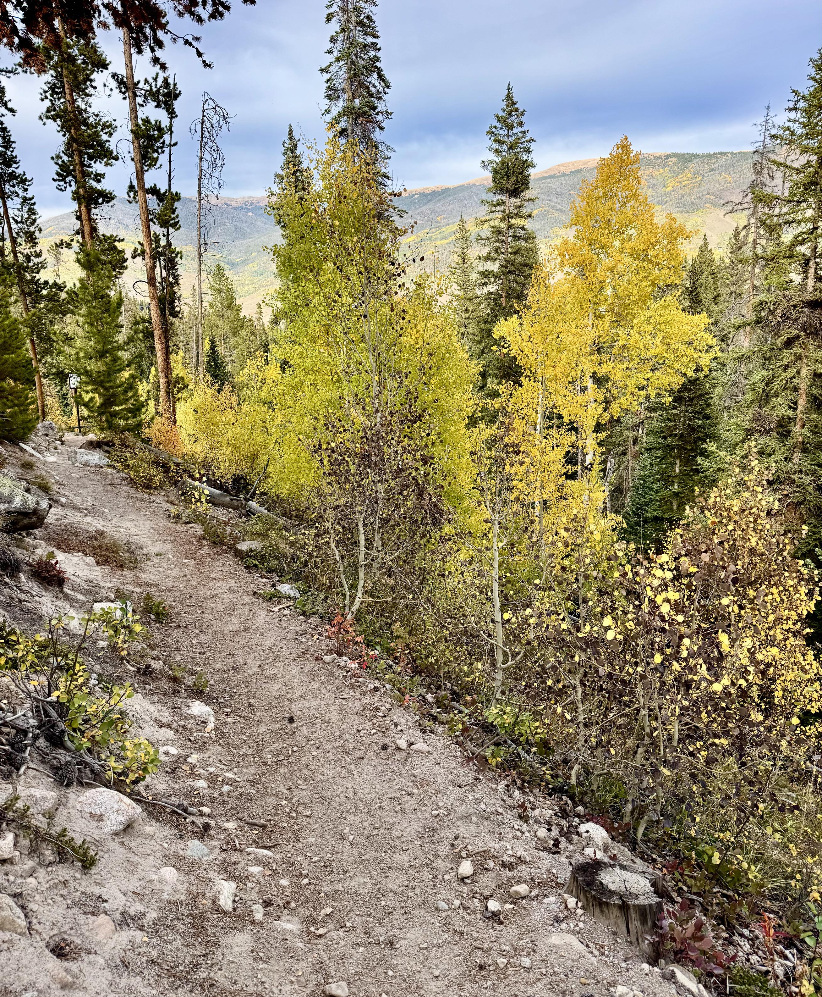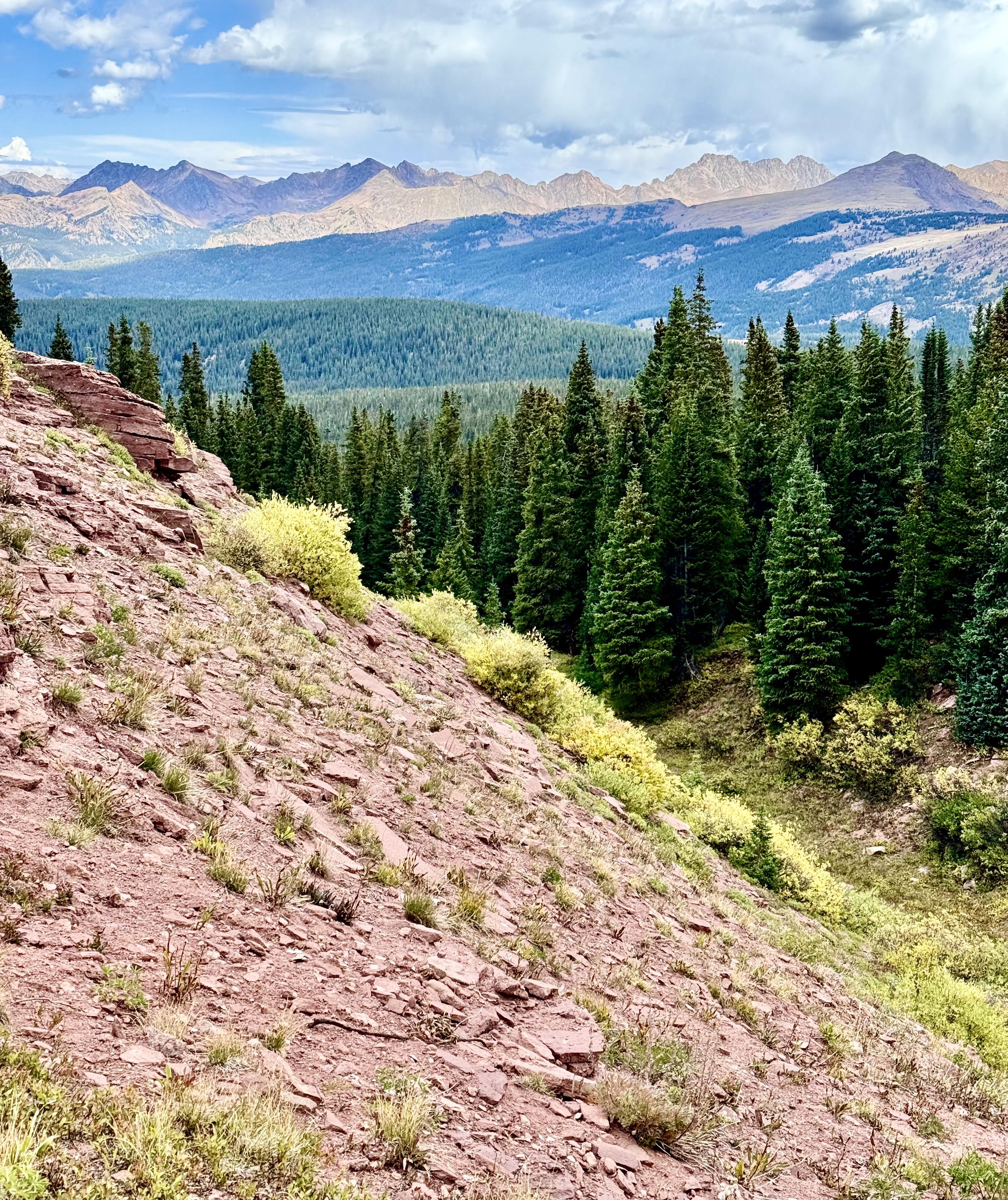 A group of hikers stands on a mountain trail, surrounded by a scenic landscape of hills and valleys. They are wearing blue shirts and various hats, with some posing playfully. Several backpacks and gear are scattered on the ground around them. The sky is blue.