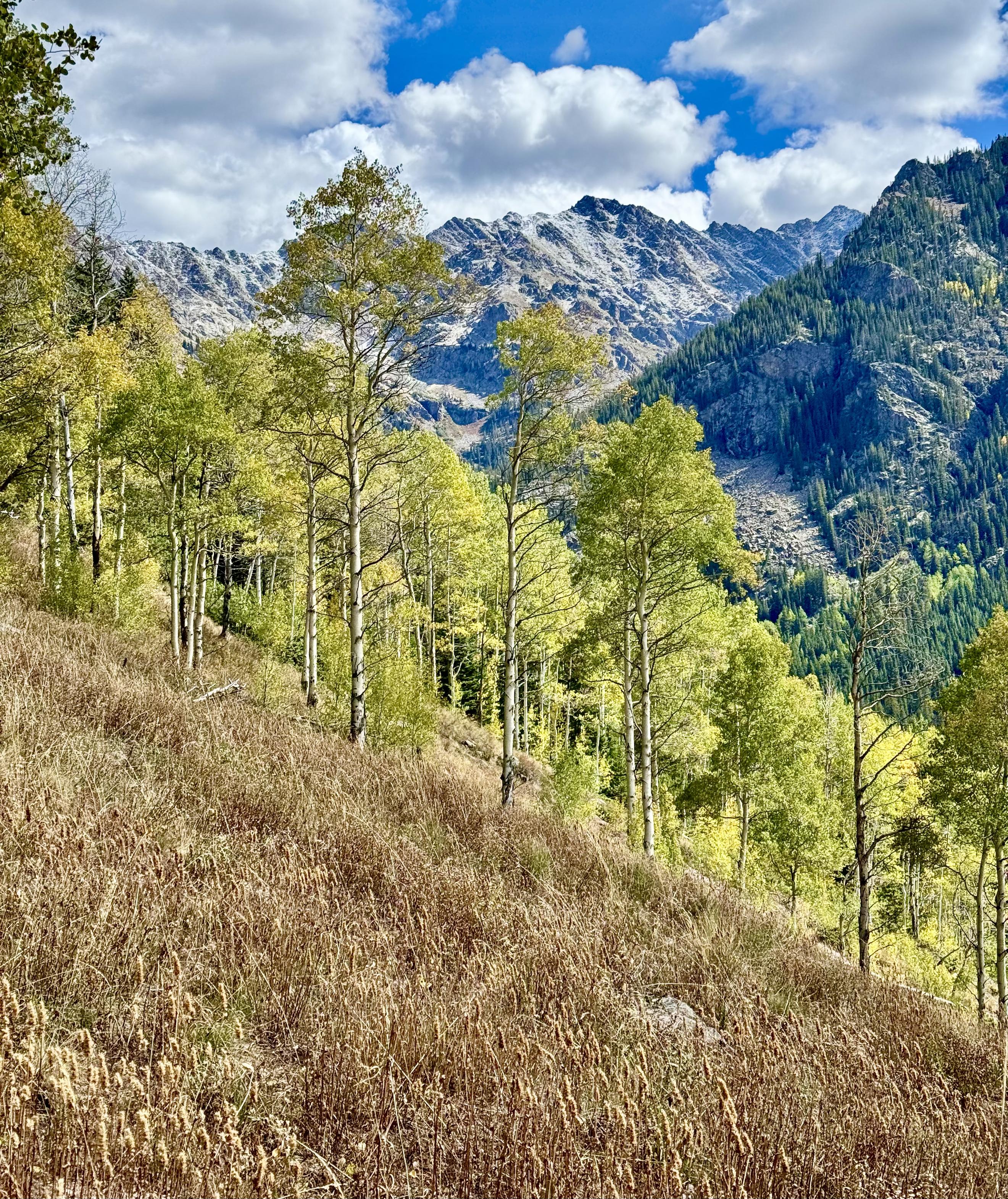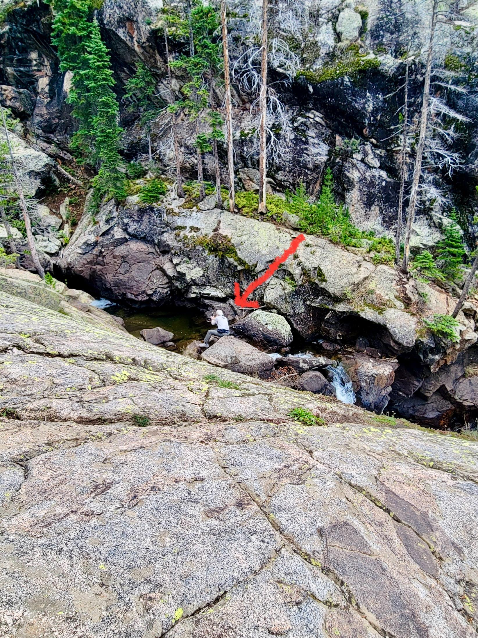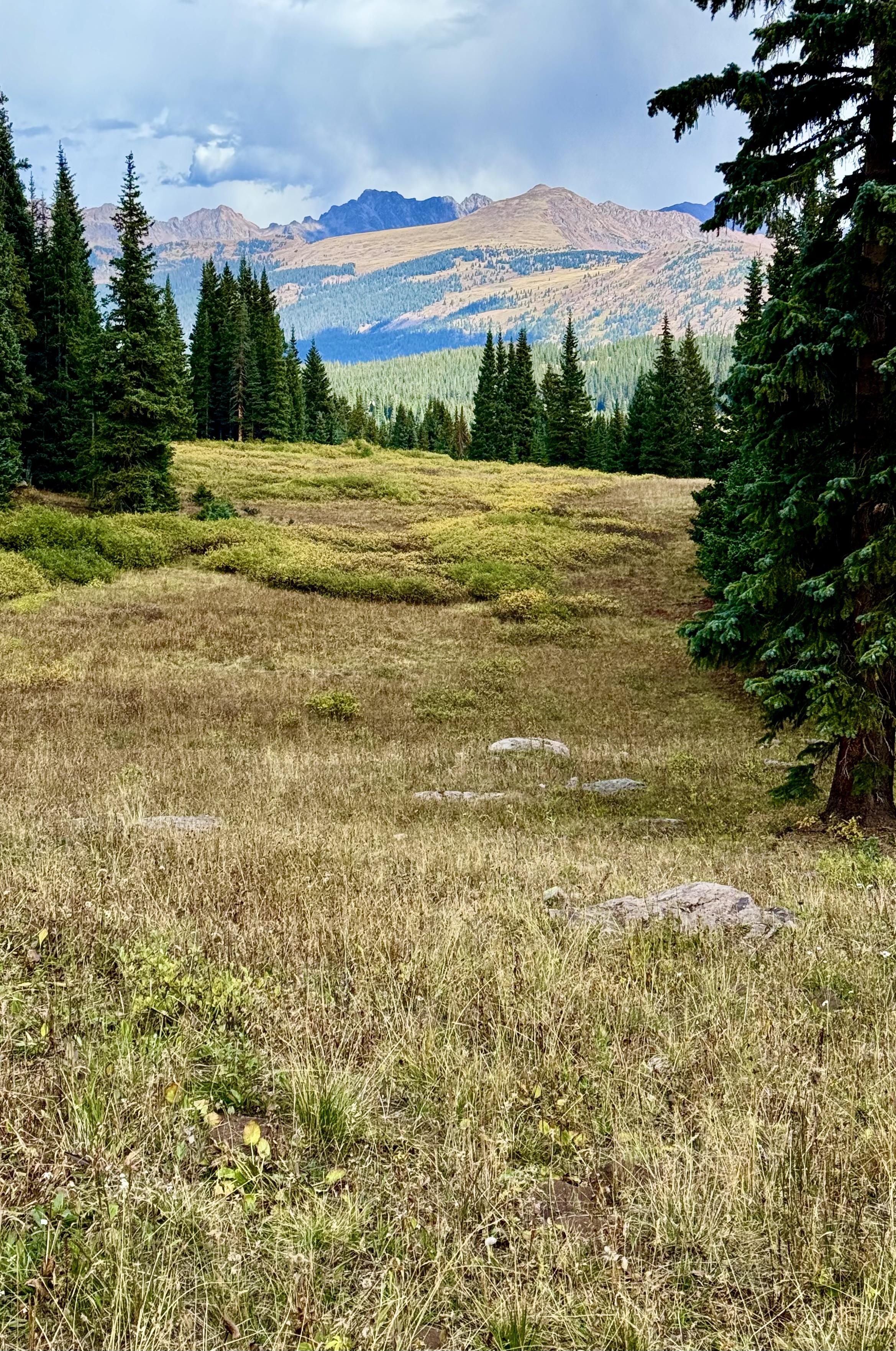 A group of hikers stands on a mountain trail, surrounded by a scenic landscape of hills and valleys. They are wearing blue shirts and various hats, with some posing playfully. Several backpacks and gear are scattered on the ground around them. The sky is blue.