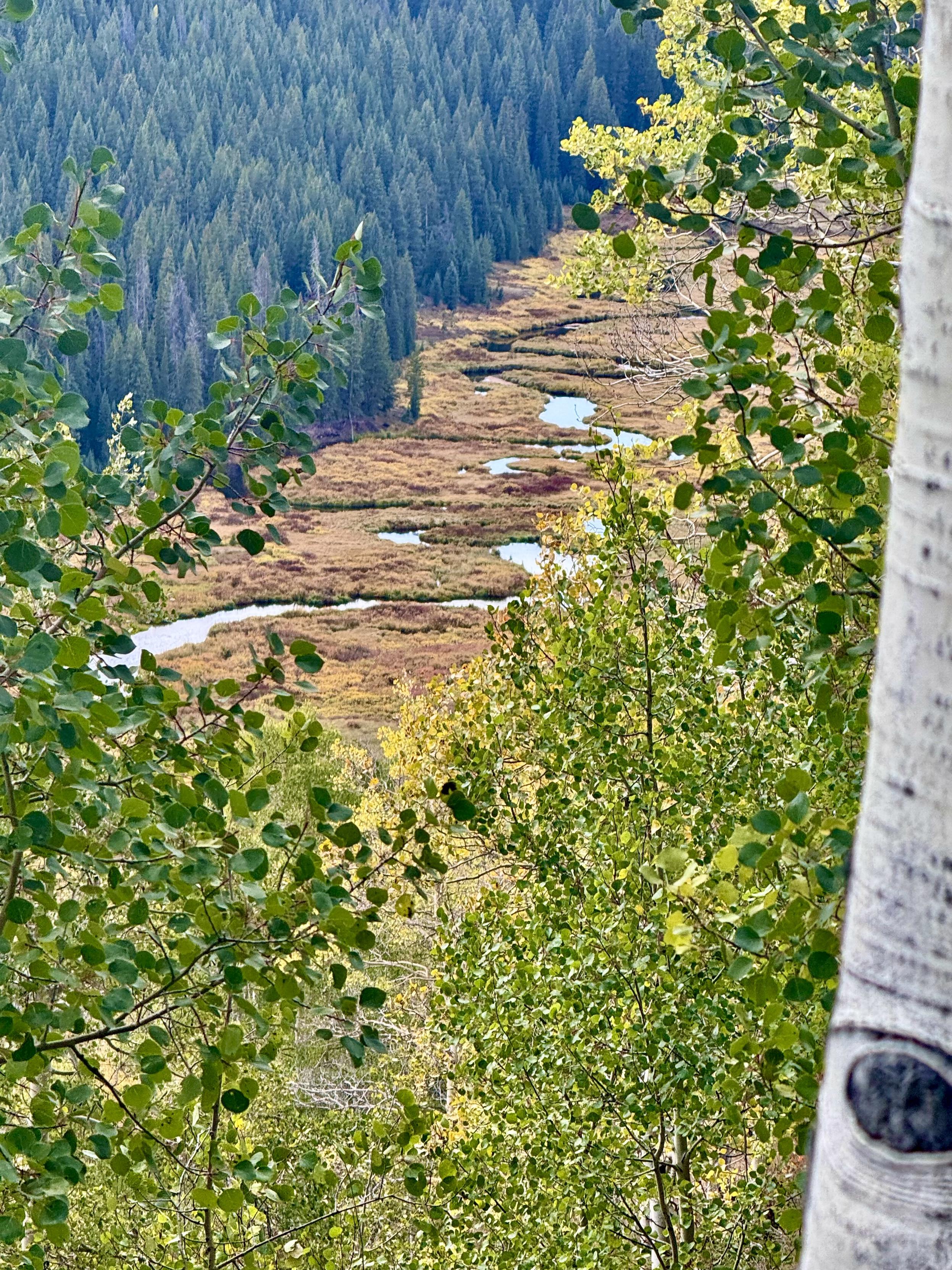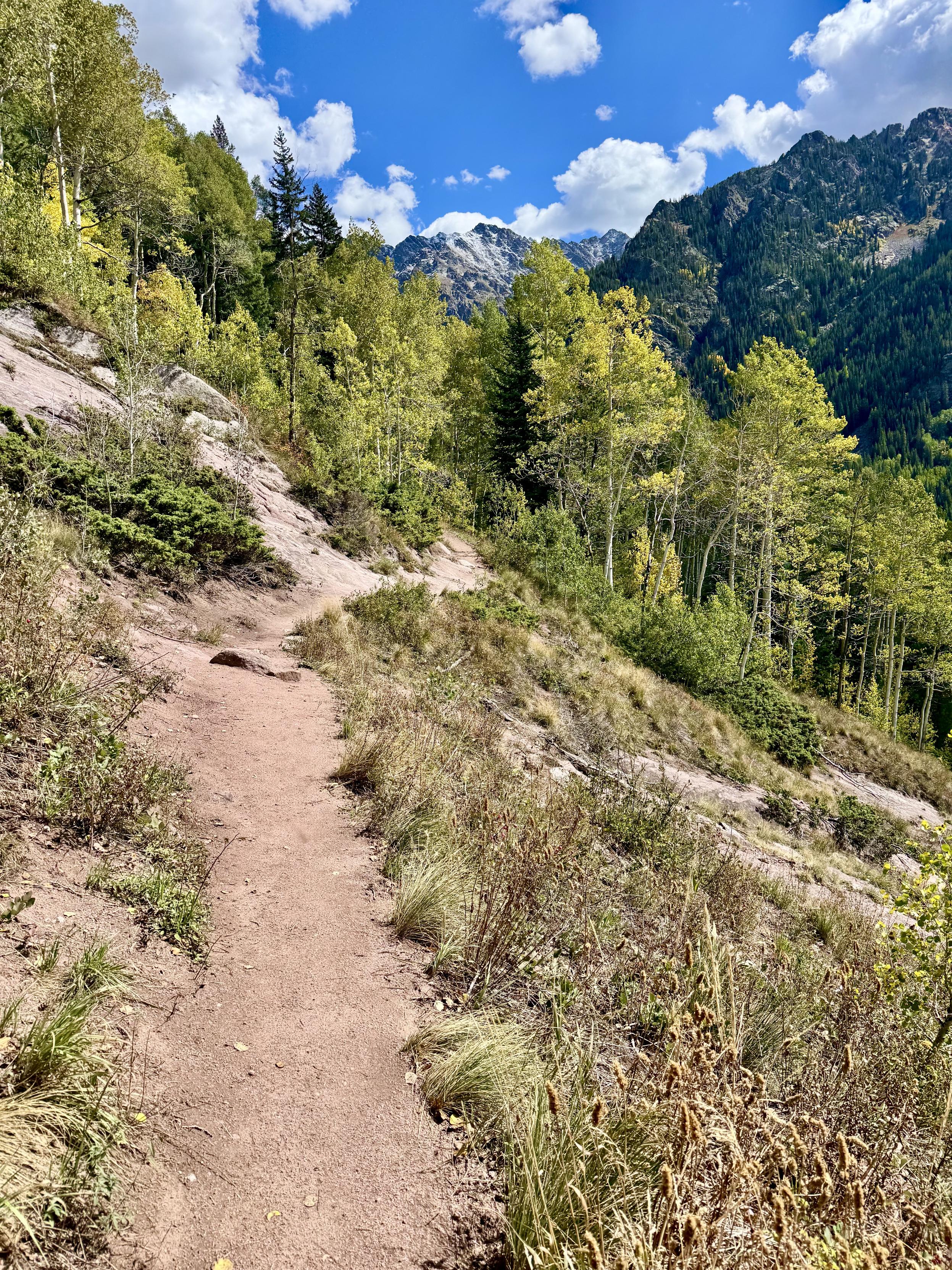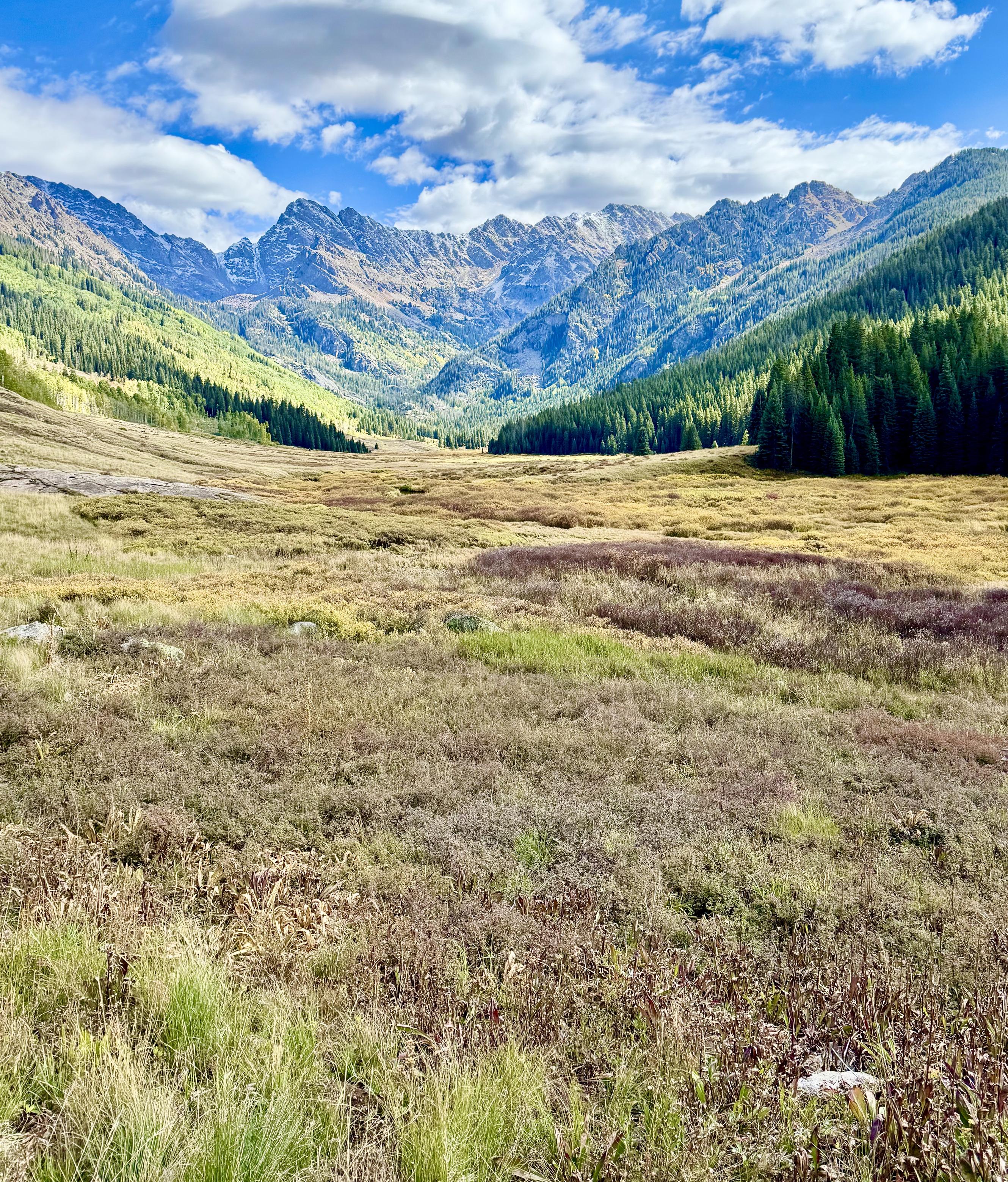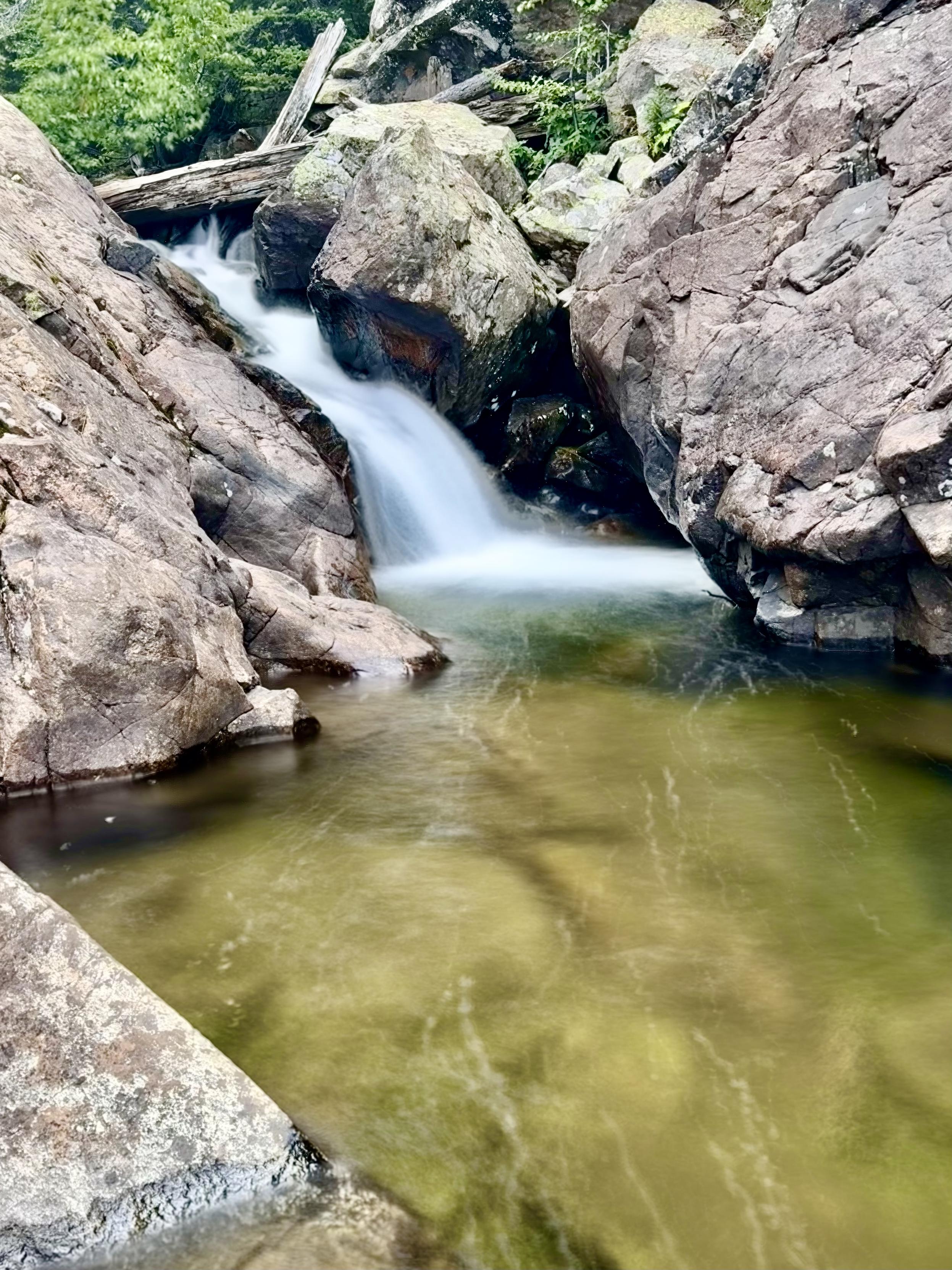A group of hikers stands on a mountain trail, surrounded by a scenic landscape of hills and valleys. They are wearing blue shirts and various hats, with some posing playfully. Several backpacks and gear are scattered on the ground around them. The sky is blue.