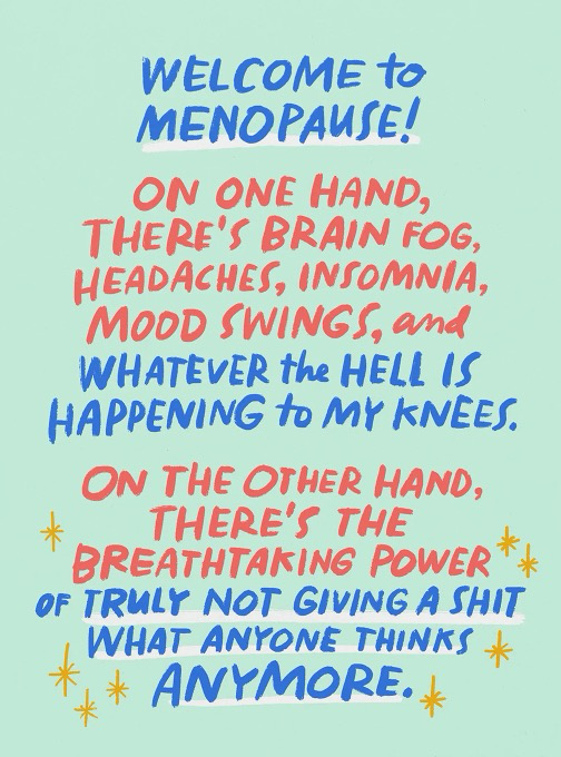WELCOME to MENOPAUSE! ON ONE HAND, THERE'S BRAIN FOG, HEADACHES, INSOMNIA, MOOD SWINGS, and WHATEVER the HELL IS HAPPENING tO MY KNEES. ON THE OTHER HAND, THERE'S THE BREATHTAKING POWER OF TRULY NOT GIVING A SHIT WHAT ANYONE THINKS ANYMORE.