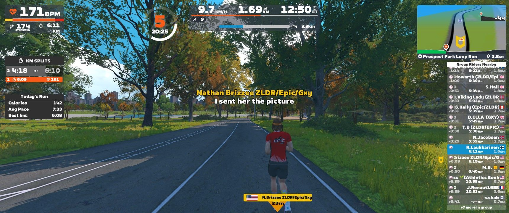 I use Zwift to run virtually when the weather is bad or I just don't feel like going outside. I rarely chat while running, but this time I ran with some pro athletes again, and the team leader wanted to send greetings to a buddy fighting cancer. I sent her some Finnish SISU.