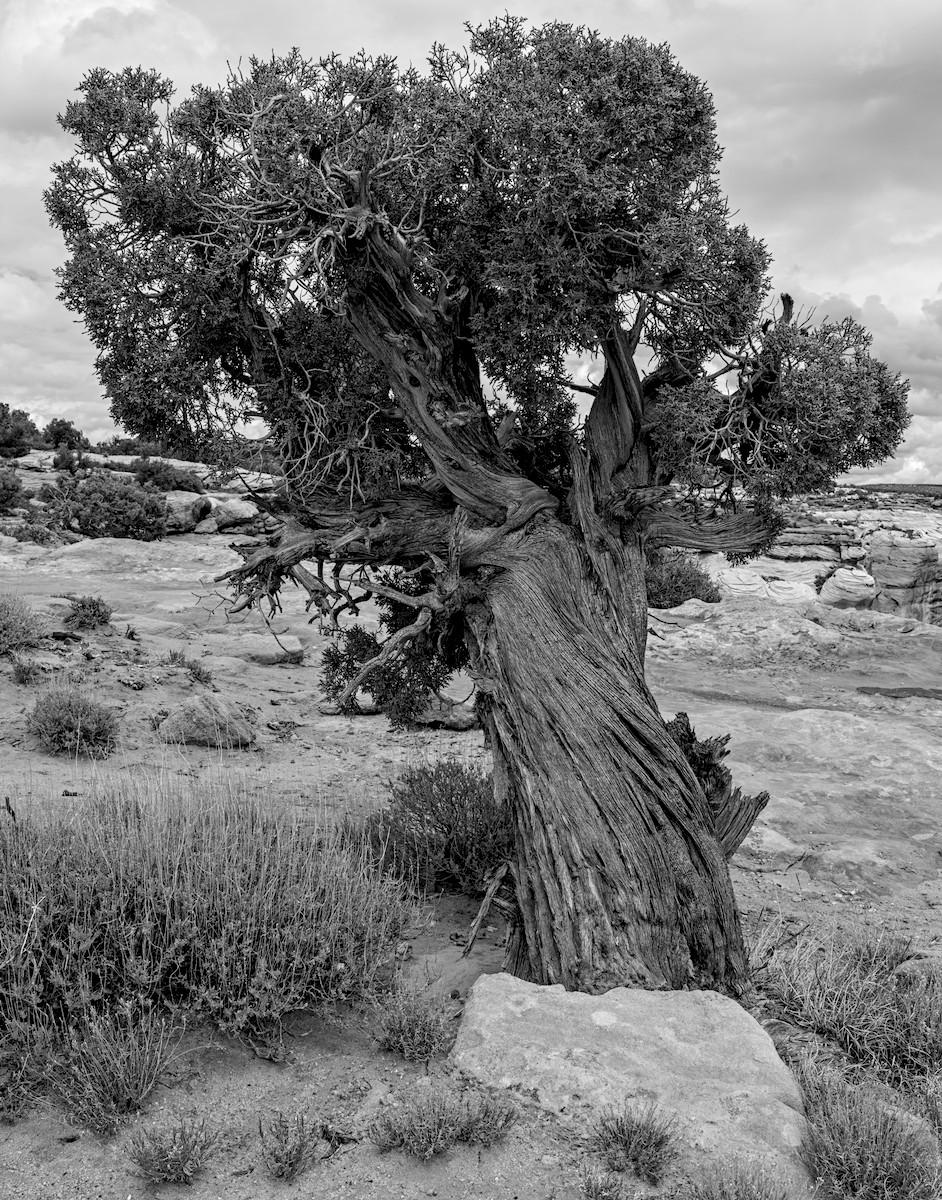 Juniperus osteosperma (Utah juniper). I love these little natural bonsai trees I found on this mesa top. They're literally all over the place. It's an elfin forest! Utah junipers generally grow to ~15 feet and can live up to a 1,000 years. This specimen, growing from a crack in the sandstone, is only ~3 feet tall. Guessing by its appearance and the size of the trunk it could be 300-400 years old or maybe more!