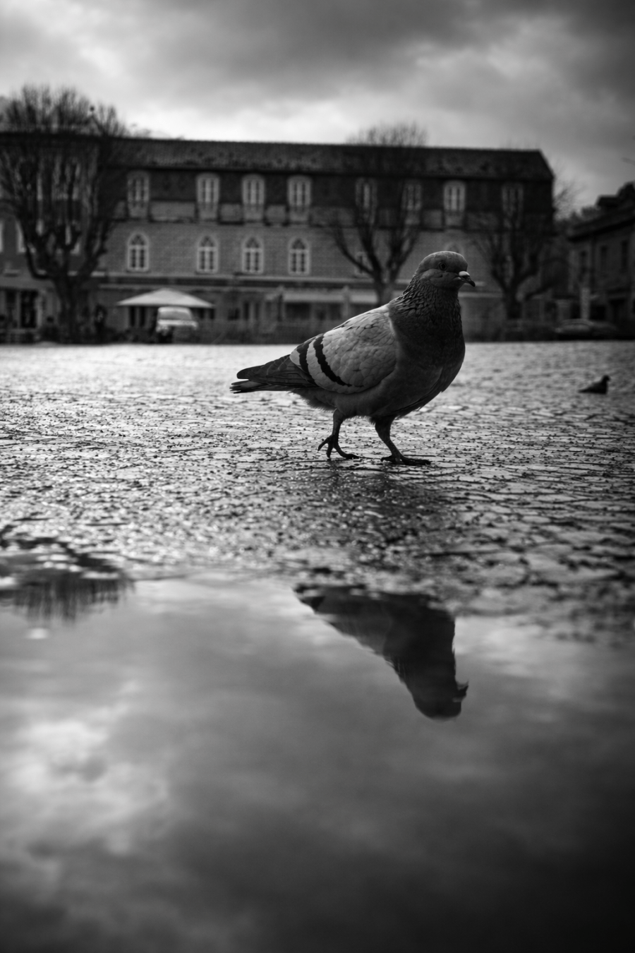 This black-and-white photograph captures an old, narrow wooden shutter door deeply set into a thick, ancient stone wall. The door consists of tall vertical planks of weathered wood, their grain still visible beneath years of sun, rain, and time, giving the surface a gently uneven texture full of small cracks and soft wear. Across the right side stretches a beautiful hand-forged iron strap hinge shaped like a slender tree branch or climbing vine. The dark iron contrasts sharply with the lighter wood and pale stone. Centered on the door hangs a simple iron ring knocker, its circular ring resting against a small decorative backplate. A small, modern padlock—the only clearly recent object—secures everything, threaded through a hasp and staple near the edge. The surrounding wall is built from irregular blocks of limestone or sandstone, each stone varying in size and shape, held together by thick, weathered mortar lines that have softened and receded over centuries. A plain stone lintel rests above the recessed doorway, its edges smoothed by long use. The whole scene carries a hushed, sculptural stillness. Strong tonal contrasts between the bright rough stone, the darker aged wood, and the deep black of the iron create a composition that feels both intimate and enduring, as though the door has guarded its threshold for hundreds of quiet years.