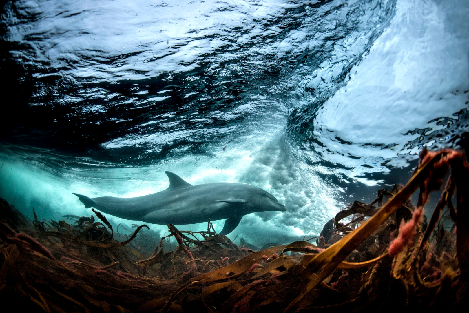 A bottlenose dolphin swims beneath waves near the village of Doolin, in County Clare, Ireland.