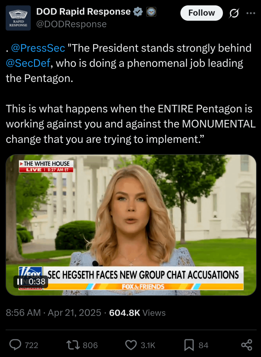 https://www.usluck.com/507984/an-official-dod-account-has-declared-that-every-single-staffer-in-the-pentagon-is-engaged-in-a-conspiracy-against-hegseth/ An official DOD account has declared that every single staffer in the Pentagon is engaged in a conspiracy against Hegseth. #Tweets #Twitter