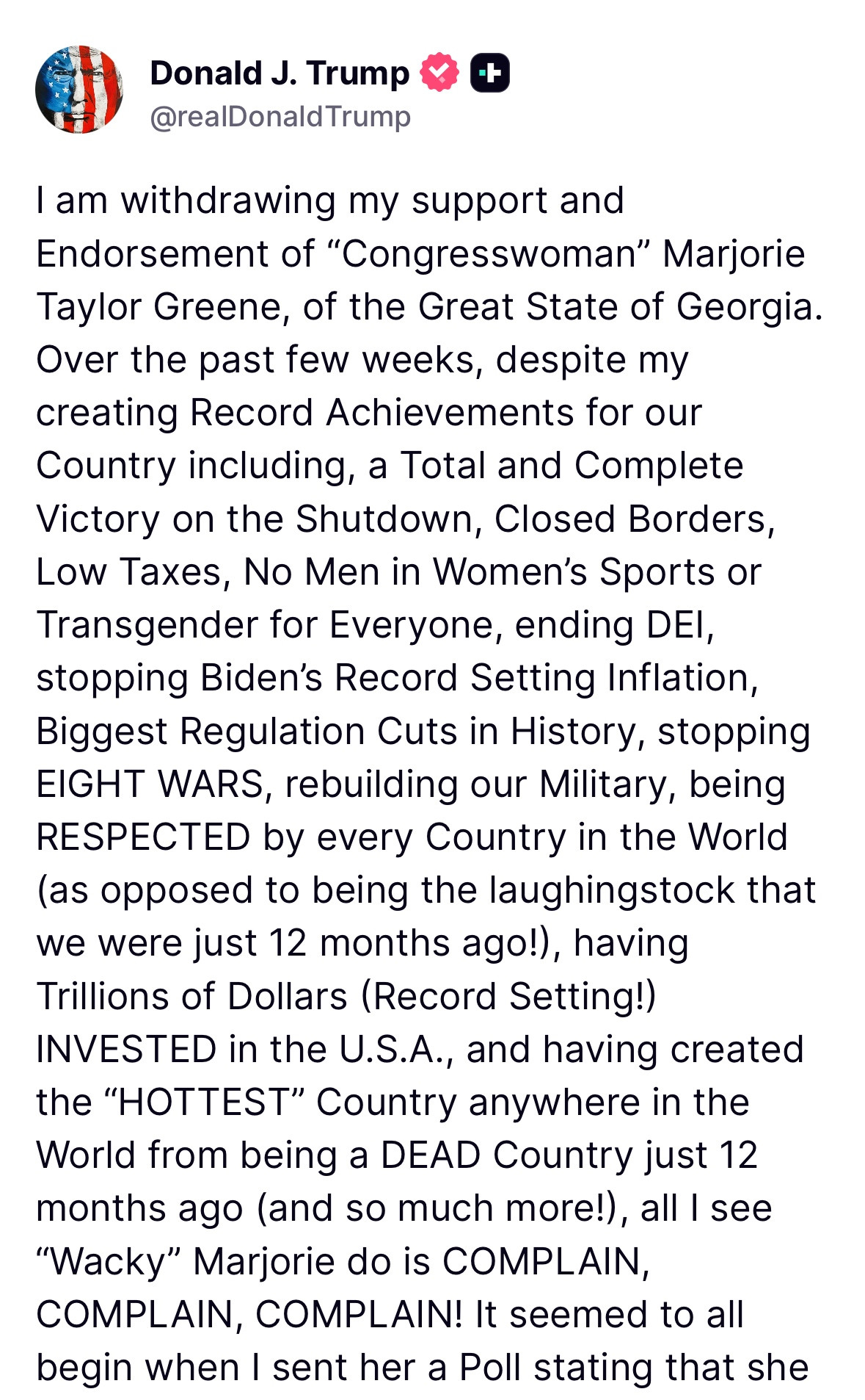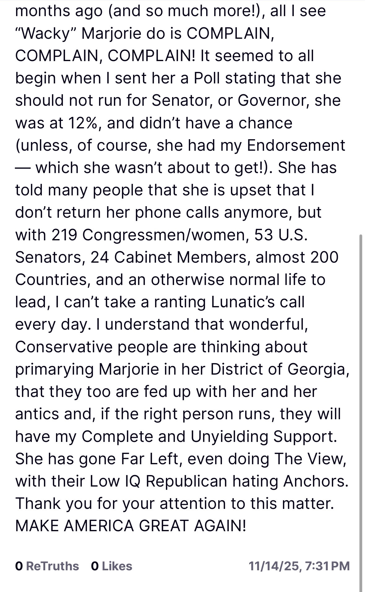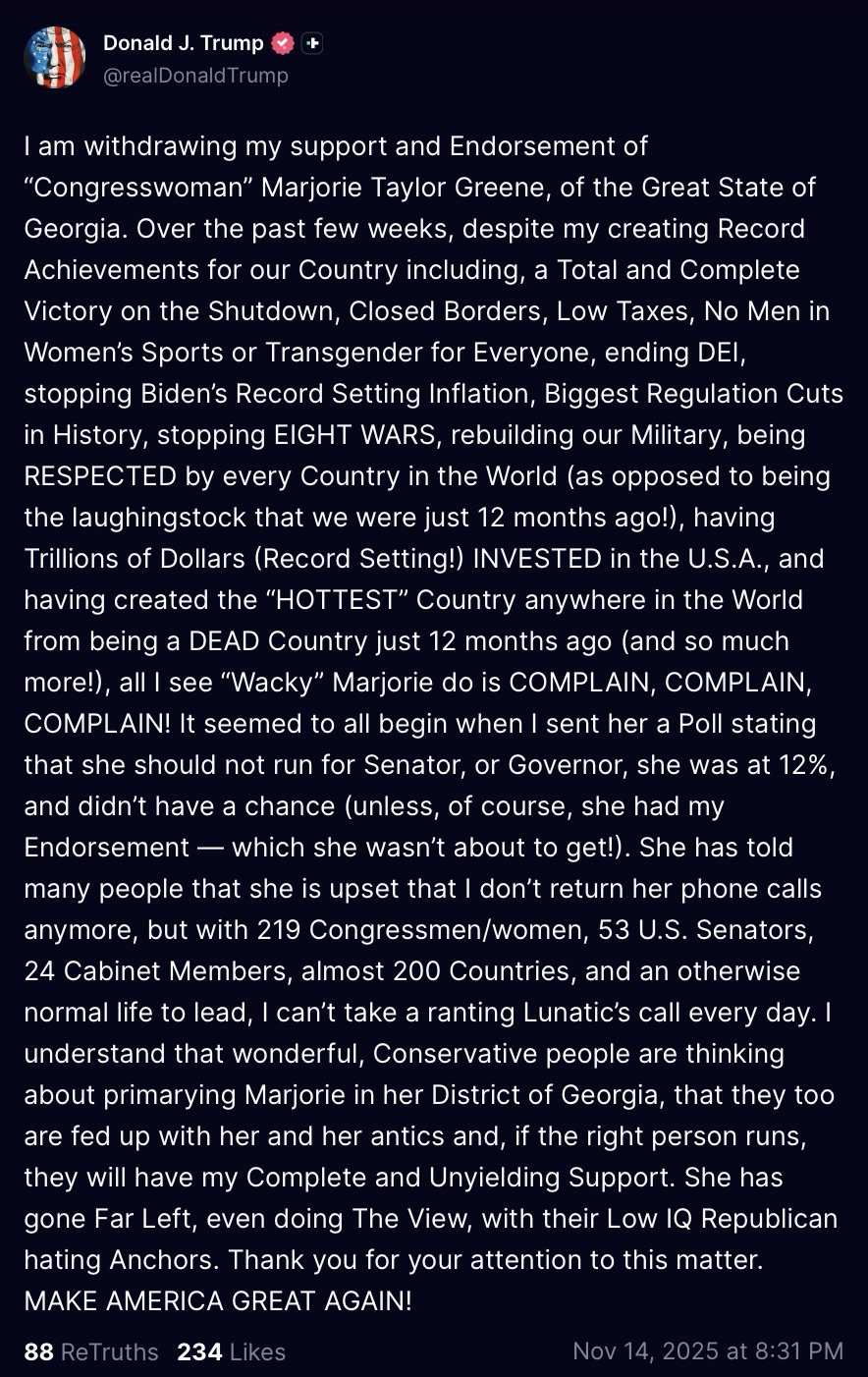https://www.theguardian.com/us-news/2025/nov/14/trump-marjorie-taylor-greene-support