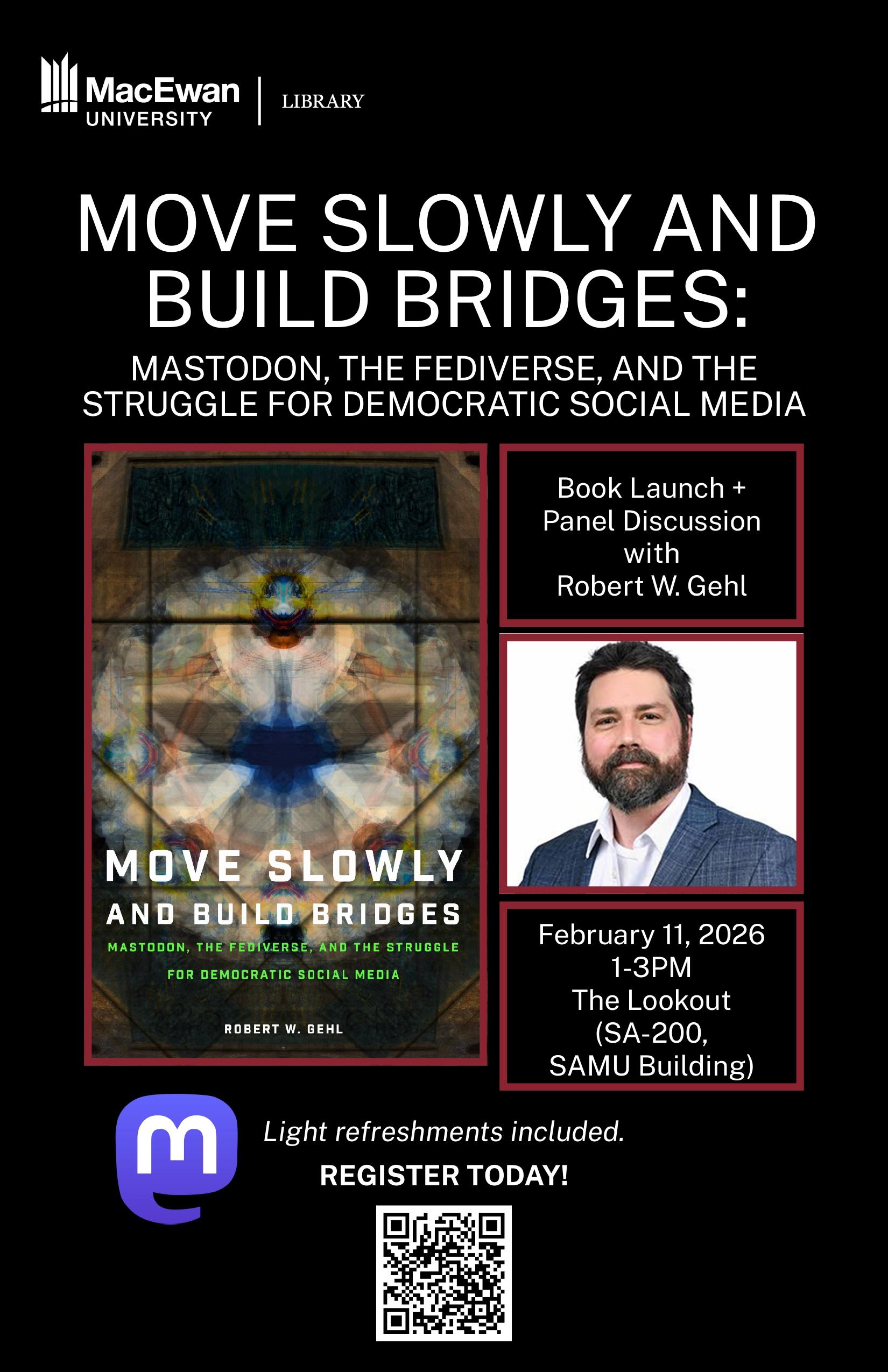 Hello #YEG! Join us at MacEwan University on February 11, 1 to 3 pm, for a book launch and panel. @rwg Robert W. Gehl, Move Slowly and Build Bridges.