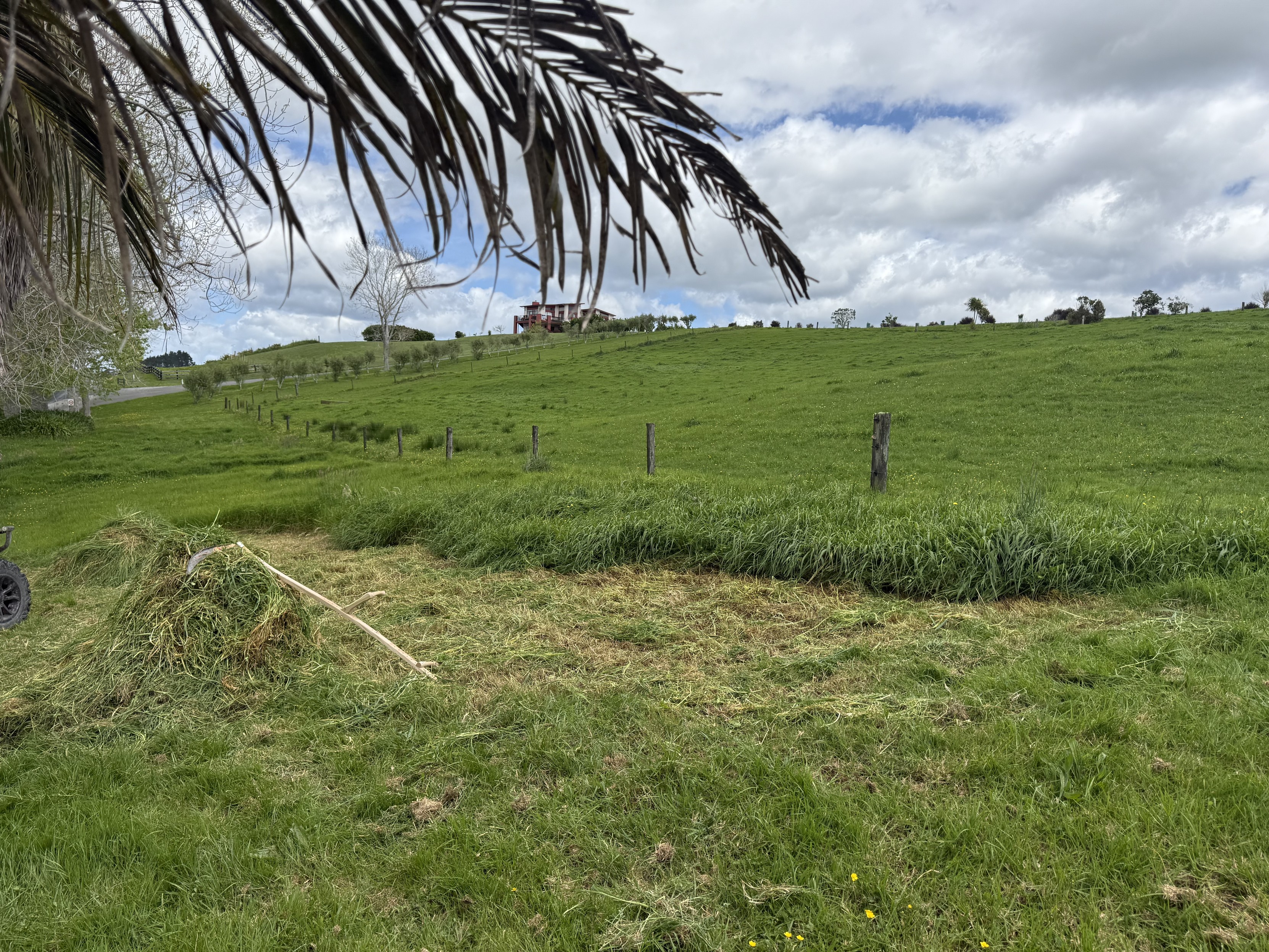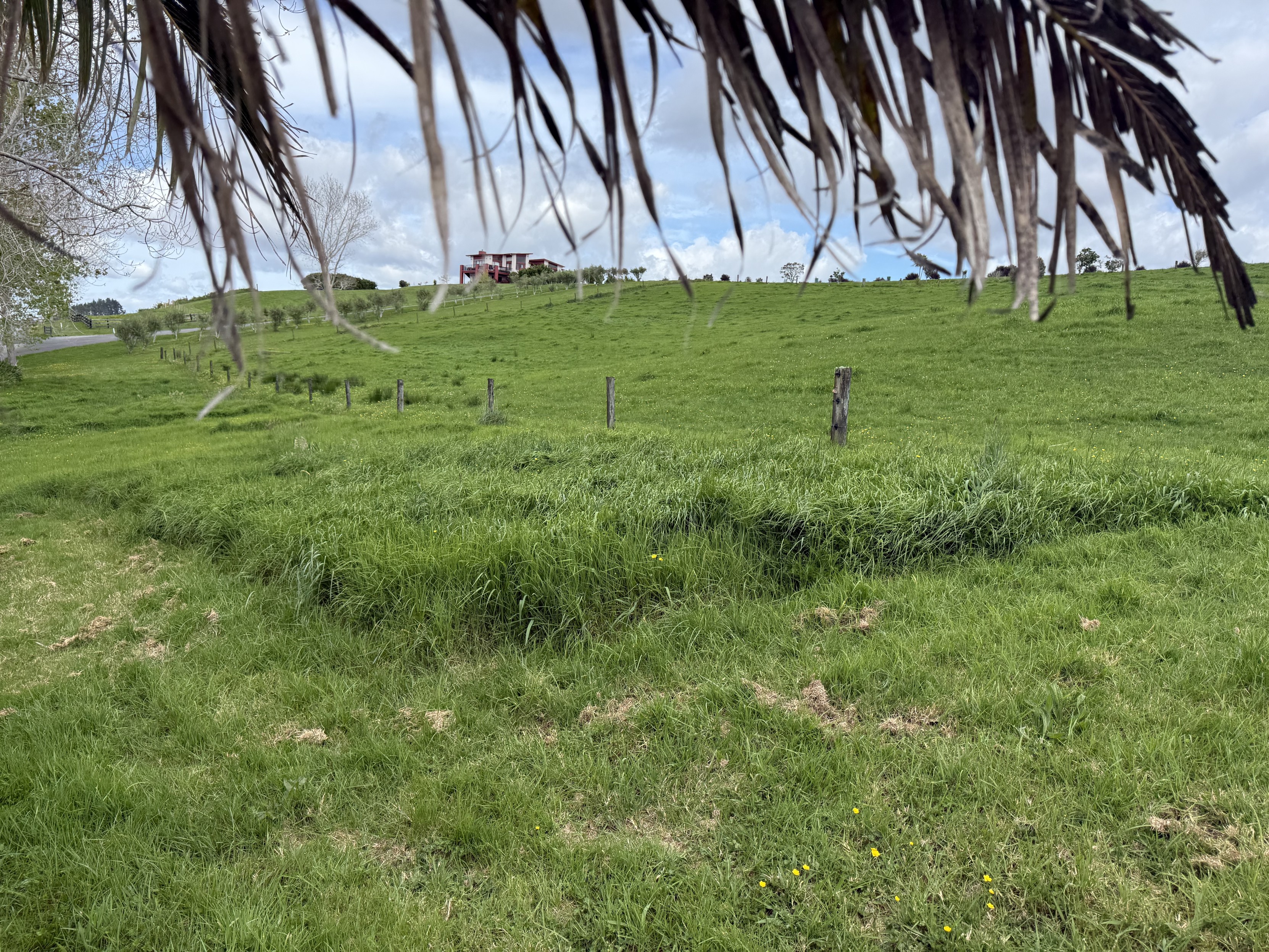 A few of a section of long grass that is uncut and probably 30-40cm high. Top of the photo is framed with a palm branch handing down. The foreground grass has been mowed some time back and has some dried grass and uneven new grass
