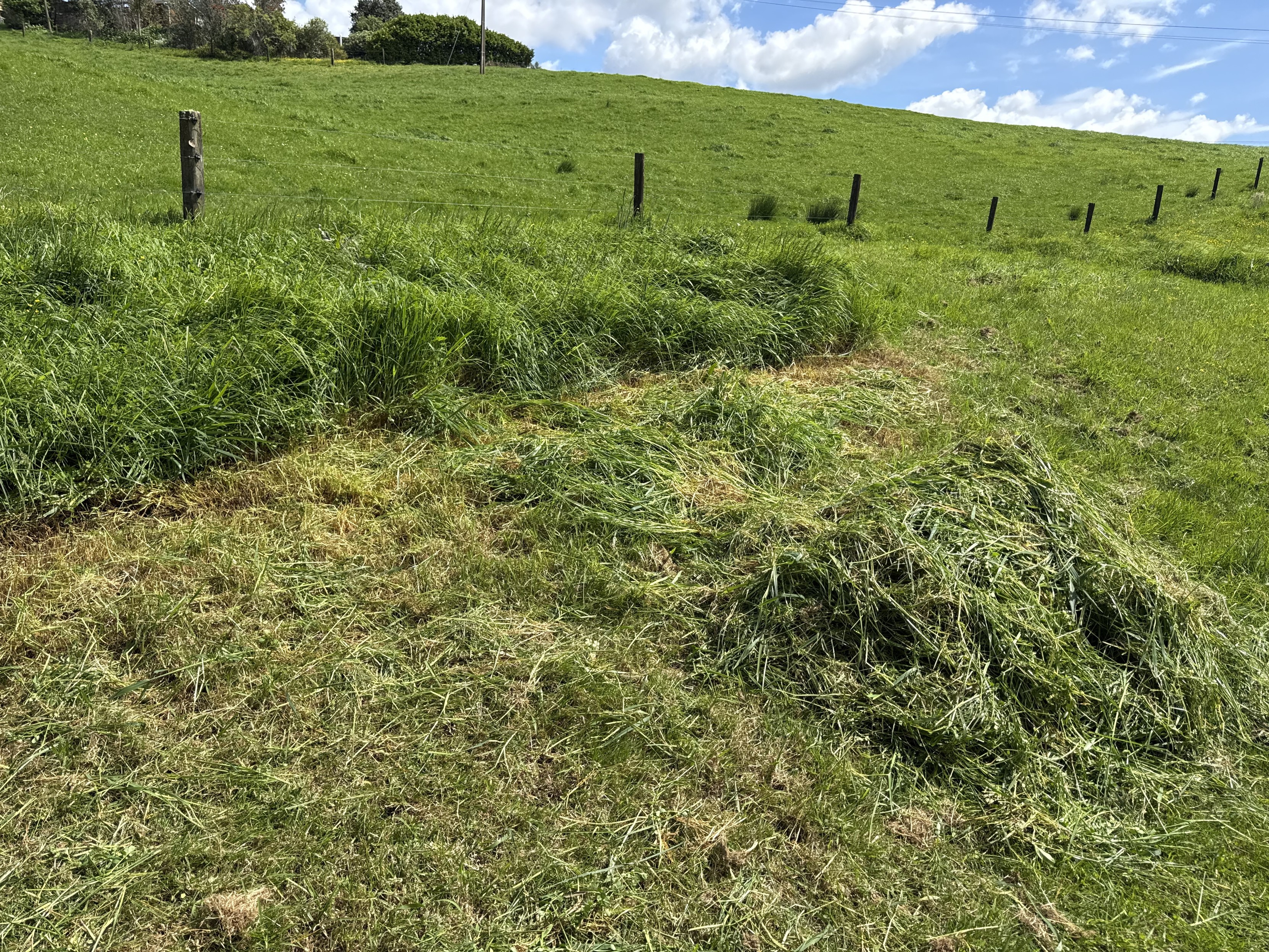 Roughly the same position as the first photo with more than a third but less than a half of the grass in this section cut. There are two mounds with the closer one nearly 1m high and the scythe resting against it.