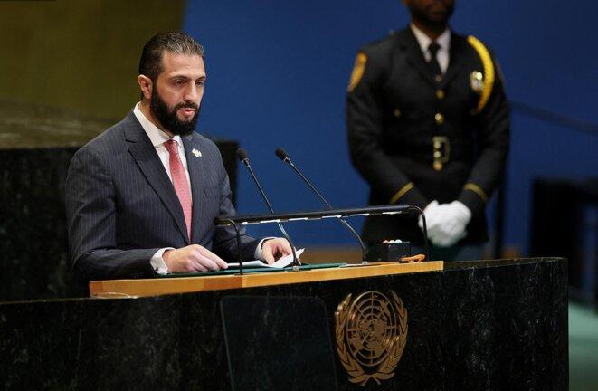 Le président syrien Ahmed al-Charaa lors de son discours devant l'Assemblée générale des Nations Unies à New York, le 24 septembre 2025. © Photo Angela Weiss / AFP